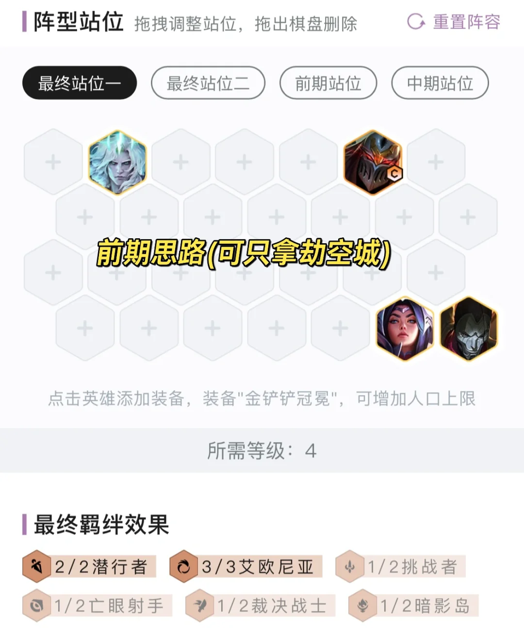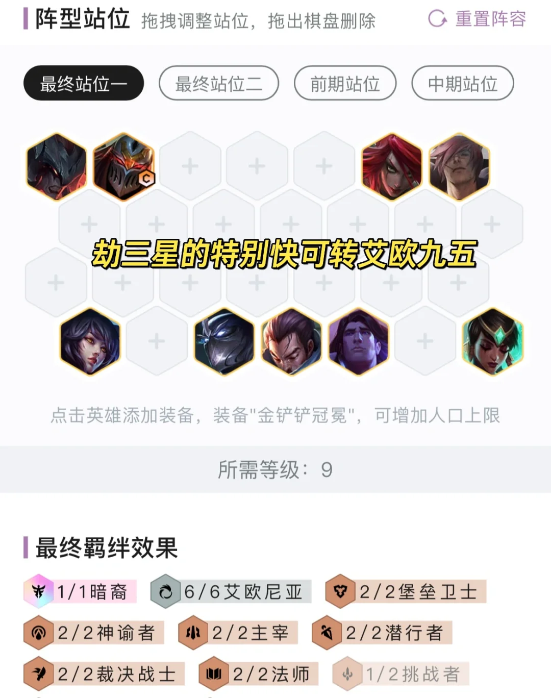 3、单劫三星进不了决赛,看整体质量和卡特能不能三星神装,如果劫三星的快,其他牌的数量少可以速8速9玩6艾欧尼亚,下面会提一嘴。