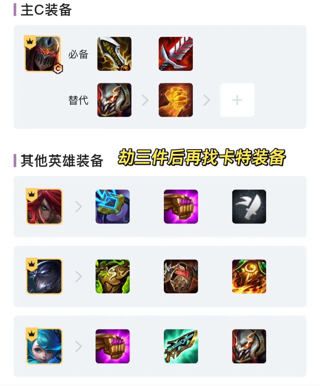 装备思路:没有珠光莲花的情况下,核心还是无尽饮血,劫装备满了之后考虑卡特的装备,有转职给转职,没有就离子法爆加续航,后期多余肉装给慎(瑟提先用)和格温(输出装)。