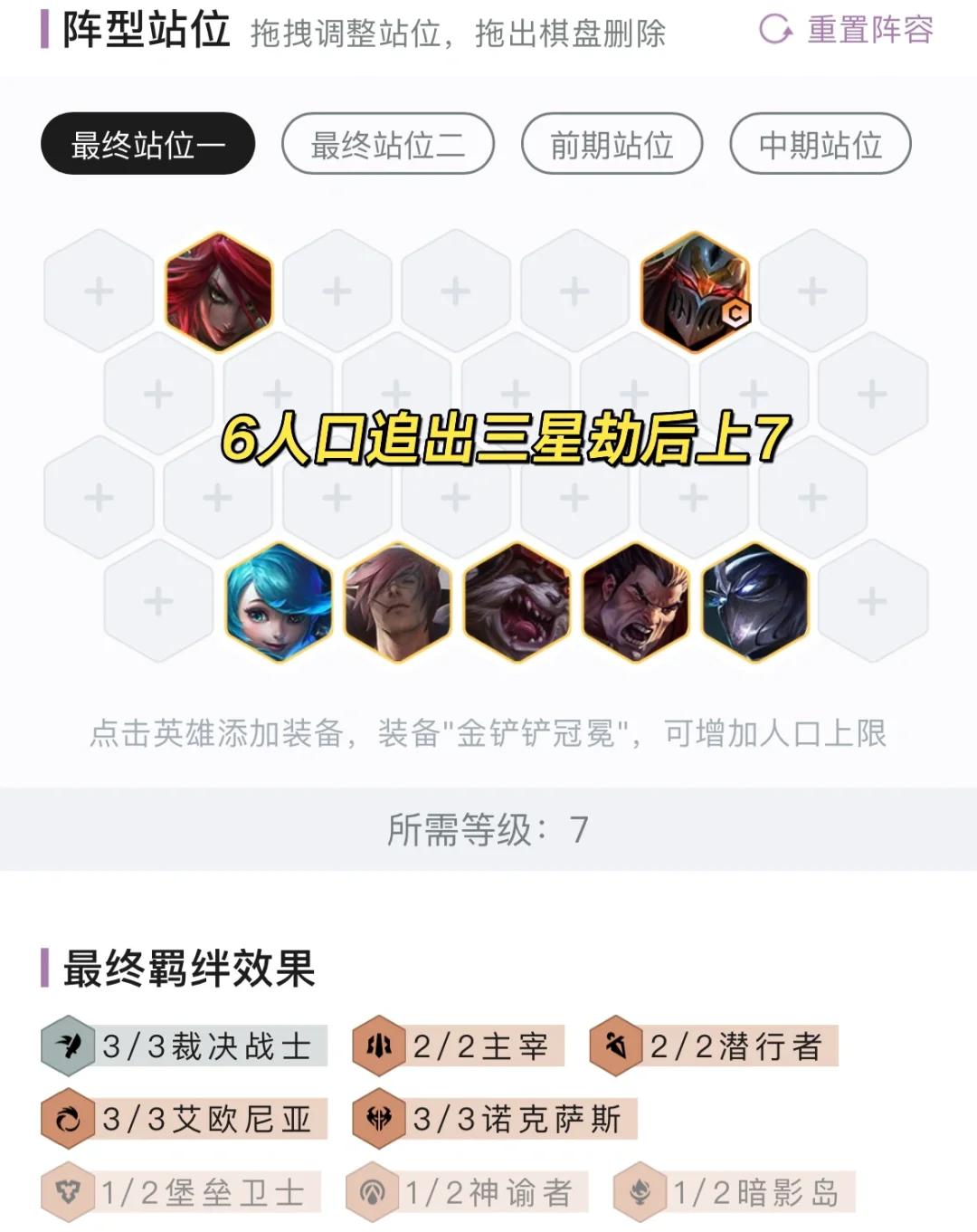劫三星后上7人口,如果卡特数量大于5张,则追出来再上8,如果张数不够多,可以先上8再追三星,八人口比较容易出橙卡,如果单劫三星特别快,可以考虑速8速9转艾欧尼亚九五。