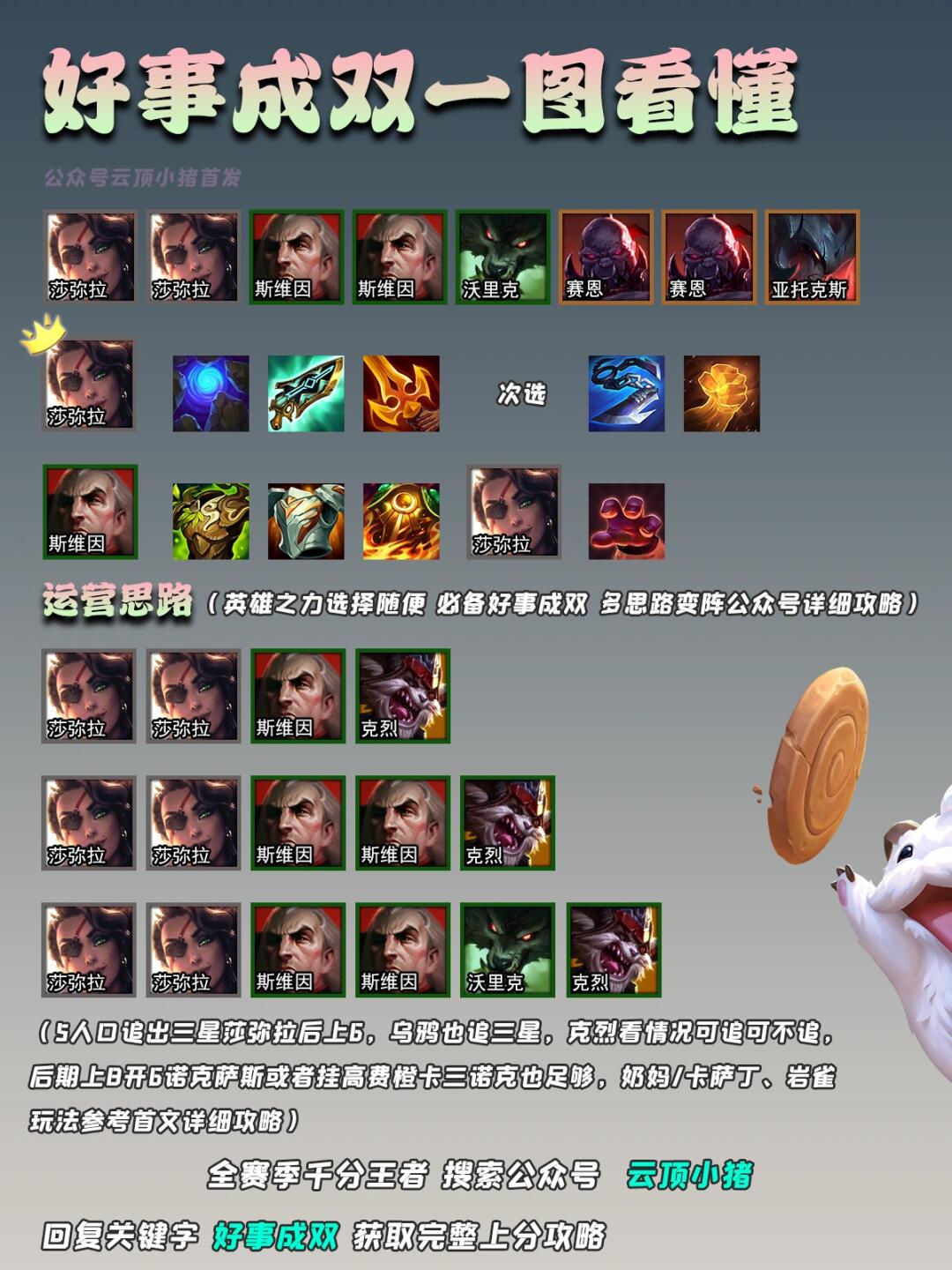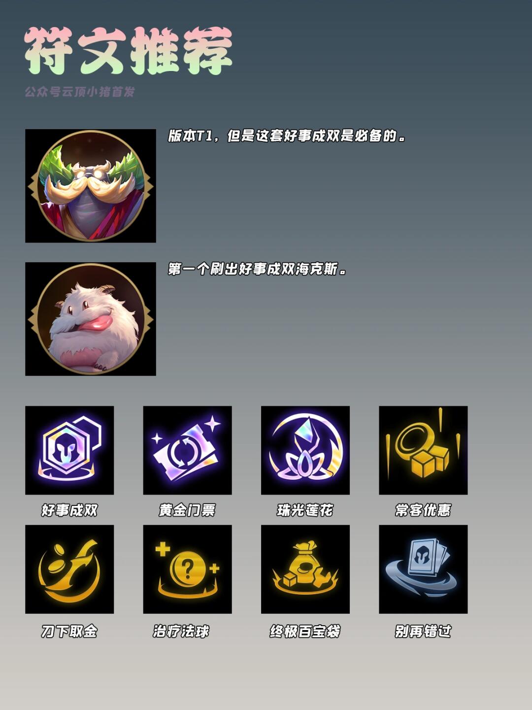 [偷笑R]S9赛季还有一周多就结束了(端游7天手游14天),今天再给大家分享一下好事成双这个隐藏冷门高吃分率的几大玩法汇总,基本上属于超易吃分的海克斯。