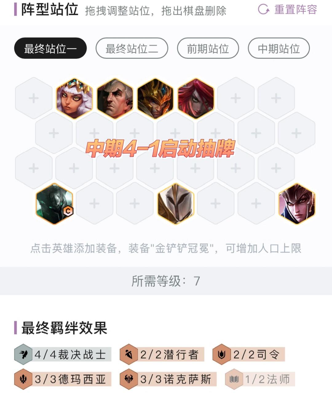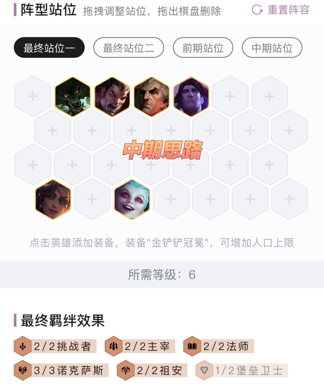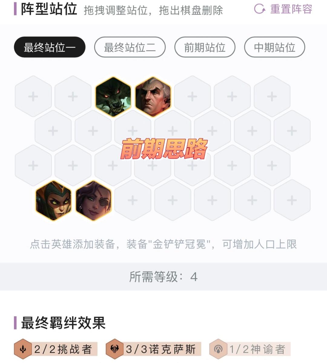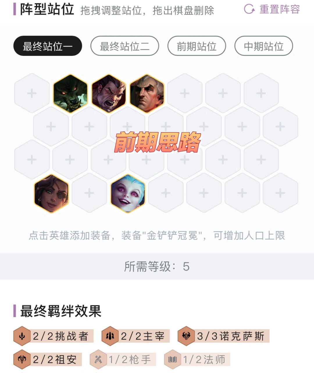 前期推荐三诺克萨斯过渡最佳,因为可以先叠一些属性,如果没有其他体系过渡也行,连胜优先。