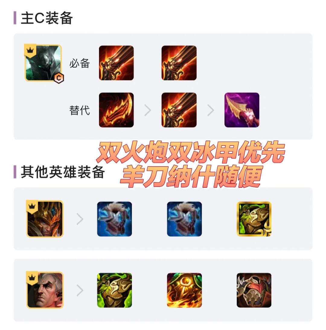 装备思路:优先做出双火炮和双冰甲,然后补个重伤好打剑姬,然后再补羊刀或者纳什都行,变出什么就什么。