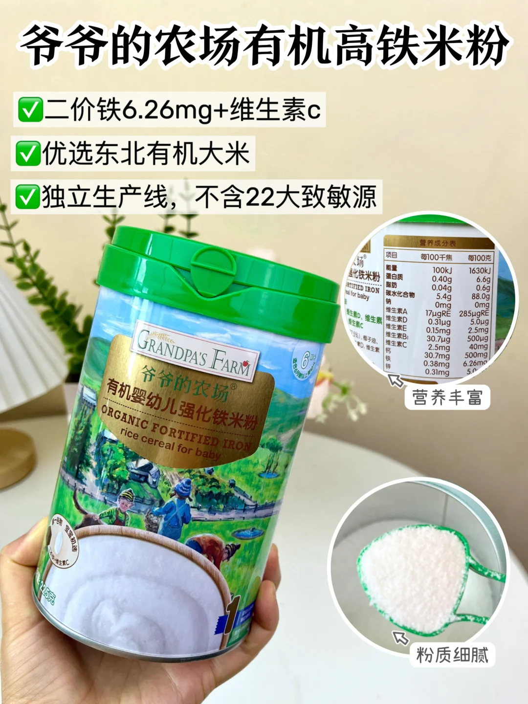 做了很久的功课才选了爷爷的农场米粉❤️有机大米原料,配料表巨干净!常见的22种敏敏原通通都没有,含铁量也超给力!6.26mg二价铁+维C组合,吸收杠杠的,妥妥营养小能手!淡淡米香味宝宝也很喜欢!