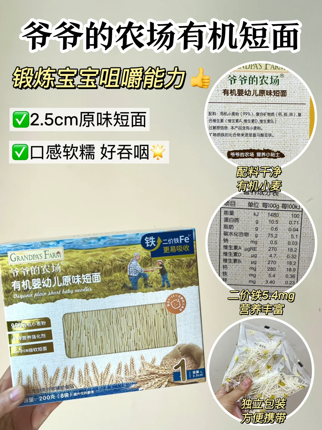 宝宝的第一口面我选的是爷爷家有机短面🔆配料表干净,没有添加剂,而且营养很丰富,除了二价铁5.4mg以外,还有其他微量元素。2.5cm长度3分钟就能煮熟,软糯不结坨,宝宝一抿就断,很好吞咽。