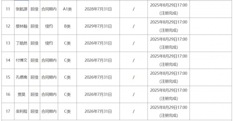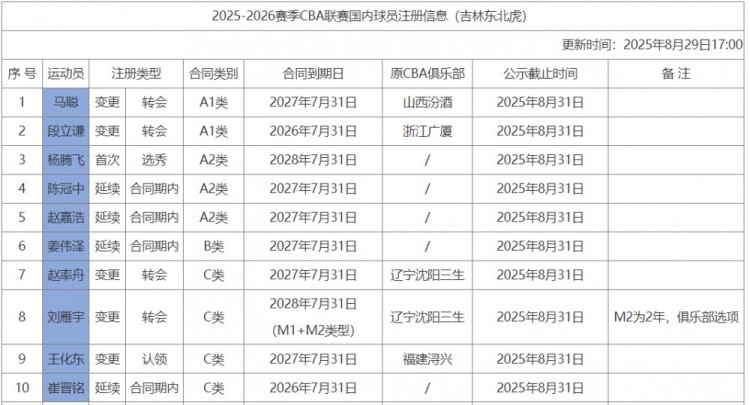 CBA官网更新了国内球员注册信息,其中,吉林新增了10名球员的注册。 姜伟泽的B类合同还有两年,赵率舟和刘雁宇均转会加盟,赵率舟签下两年C类合同,刘雁宇也是C类合同,至少到2028年。
