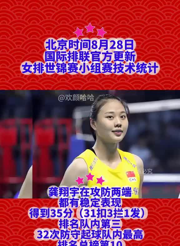 国际排联最新排名:龚翔宇世界排名第10。 欢颜哈哈。 北京时间8月28日,龚翔宇55分,进攻前三,吴梦洁41分,吴梦洁35分。龚翔宇在攻防两端都有稳定表现。国际排联官方更新女排世锦赛小组赛技术统计,得到35分(31扣3拦1发),排名队内第三,32次防守起球队内最高,排名总榜第10,龚翔宇31分。