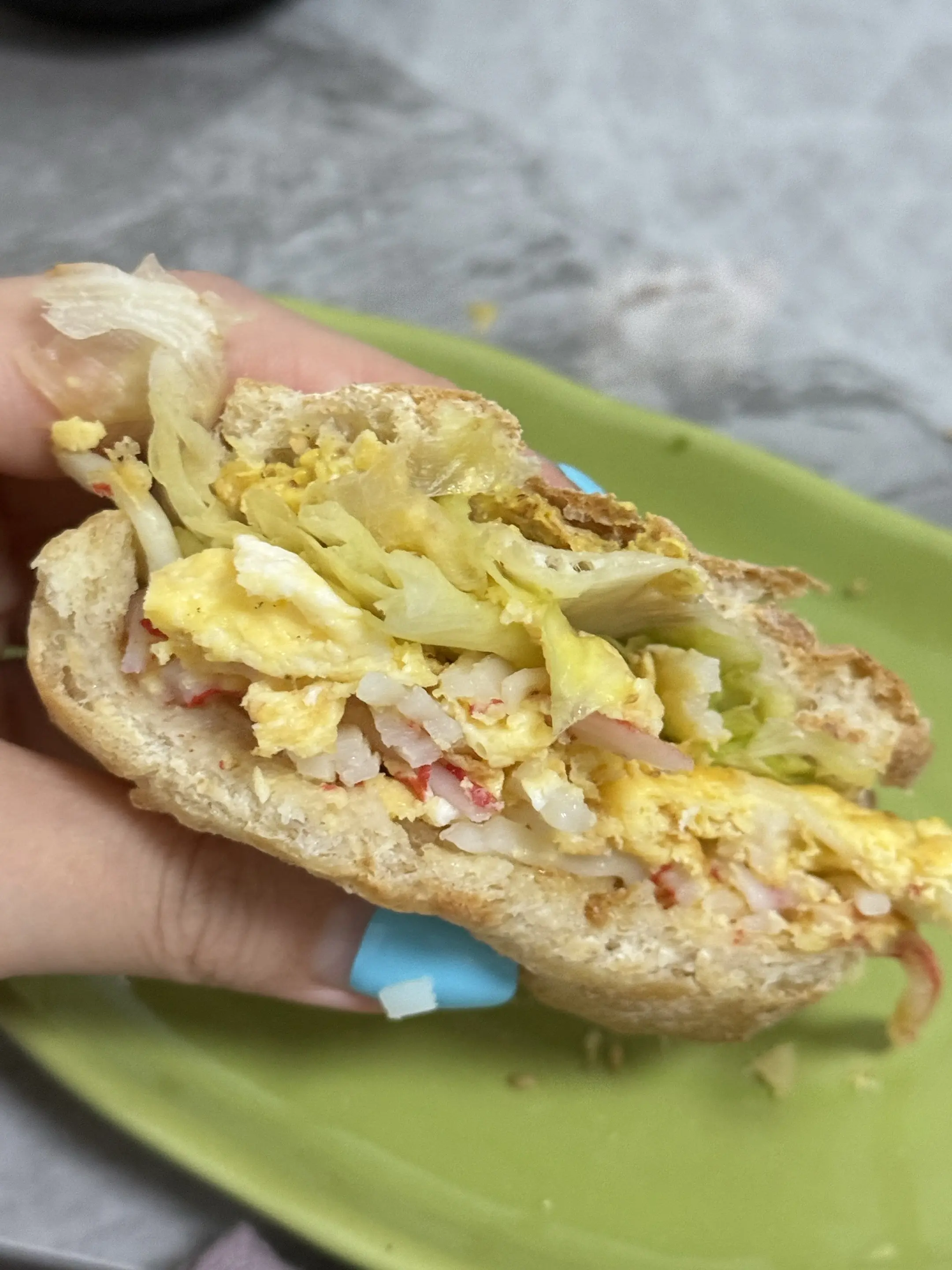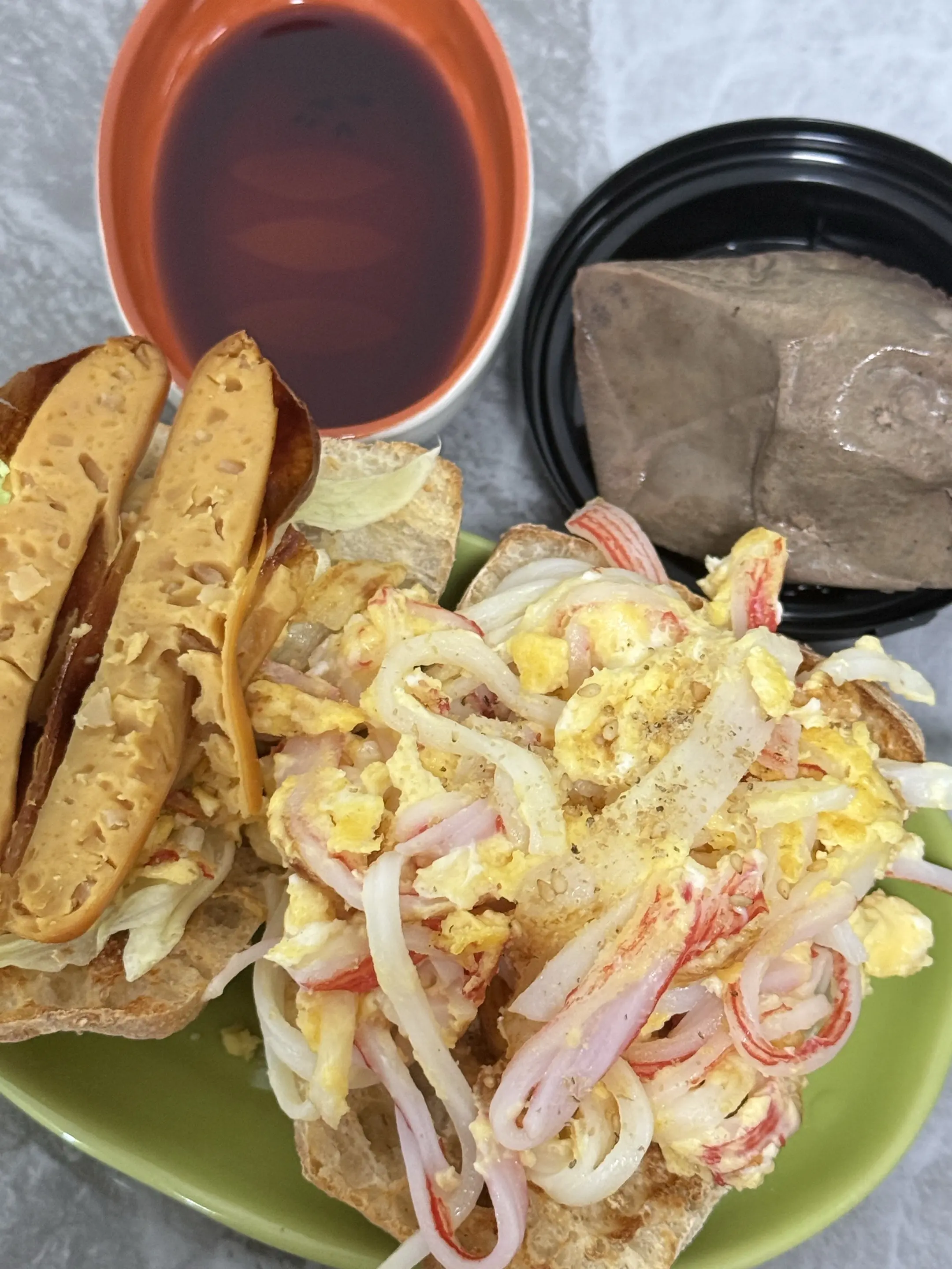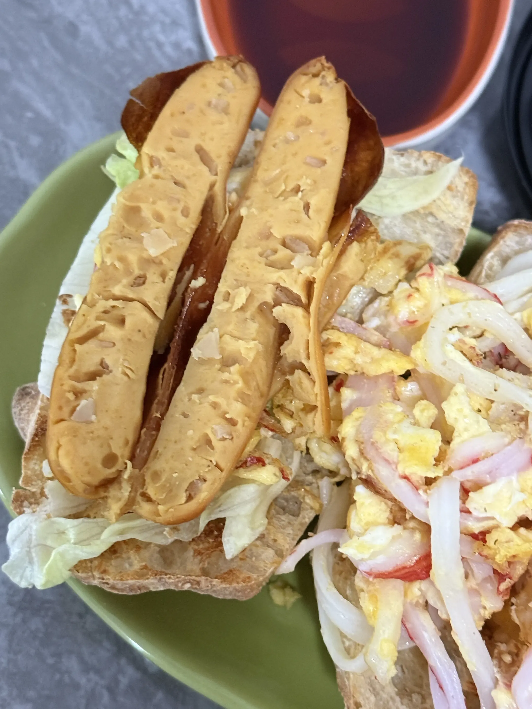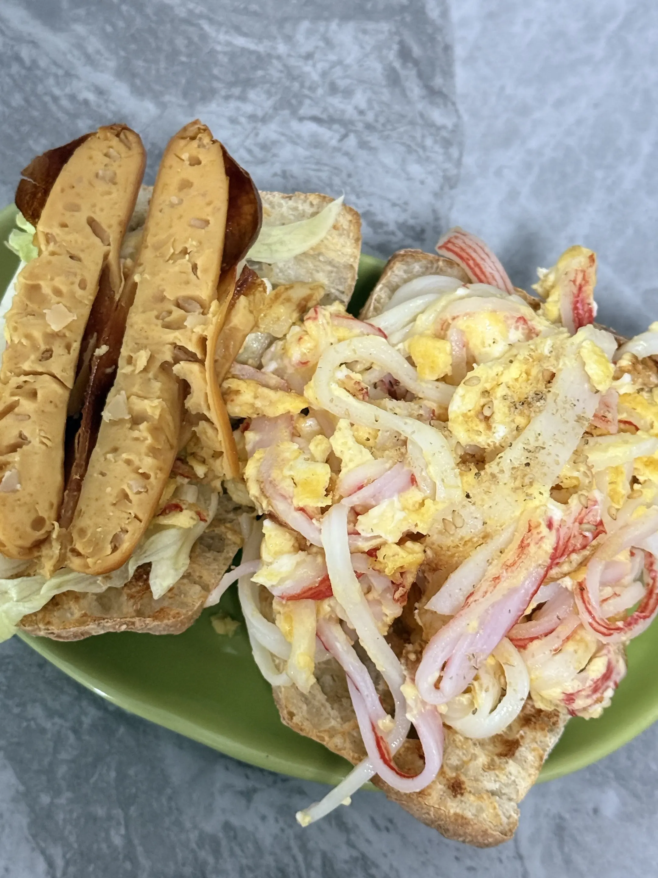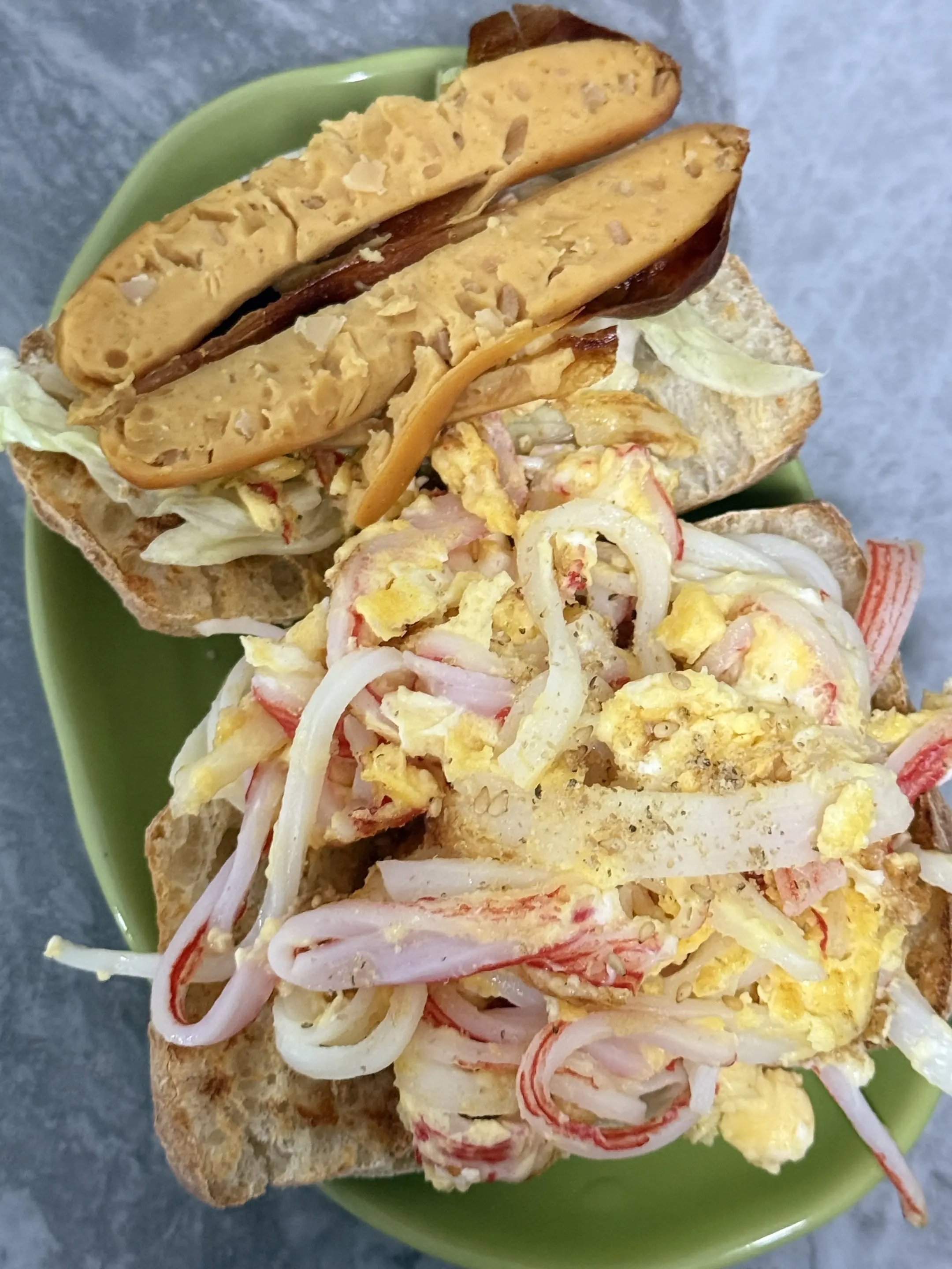 今日午餐:全麦蟹柳滑蛋恰巴塔➕烟熏烤肠