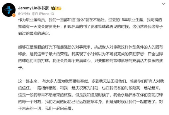突发:林书豪发博宣布退役! “作为职业运动员,我们一直都知道“退休”就在不远处。过去的15年职业生涯,我明确的知道有一天我会需要离开,但现在真的到了要和篮球说再见的时候,这仍然是我这辈子做过的最难的决定。”