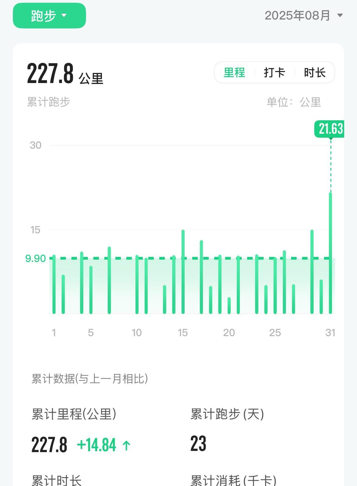 8月份跑步小结: 跑步24次 累计公里:227.8km 最长距离:21.6km