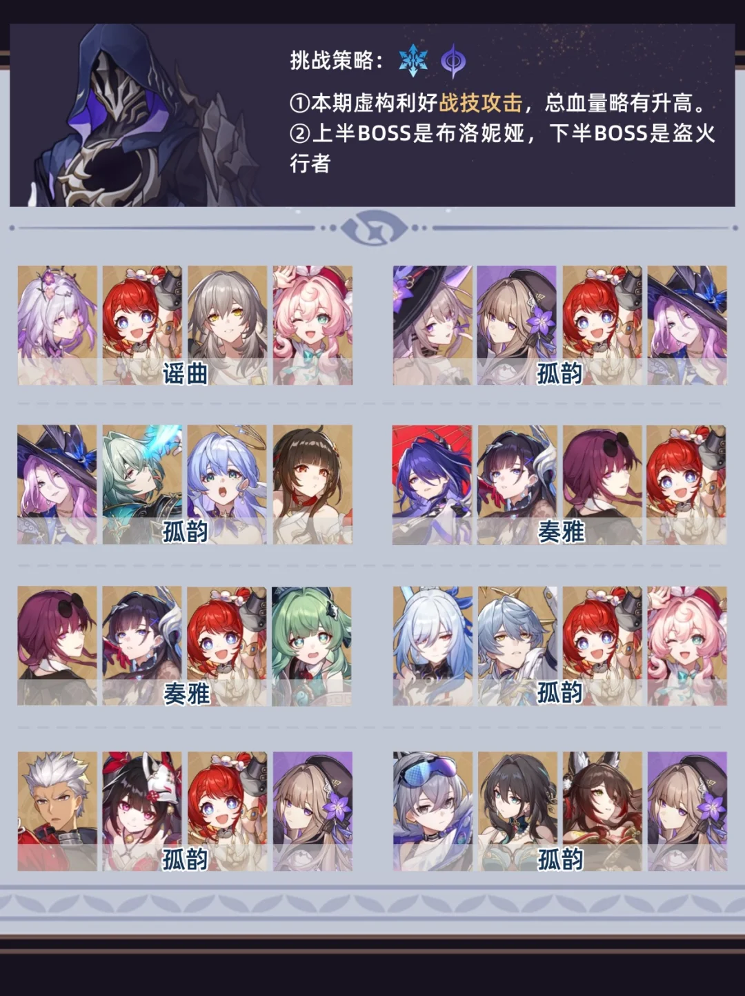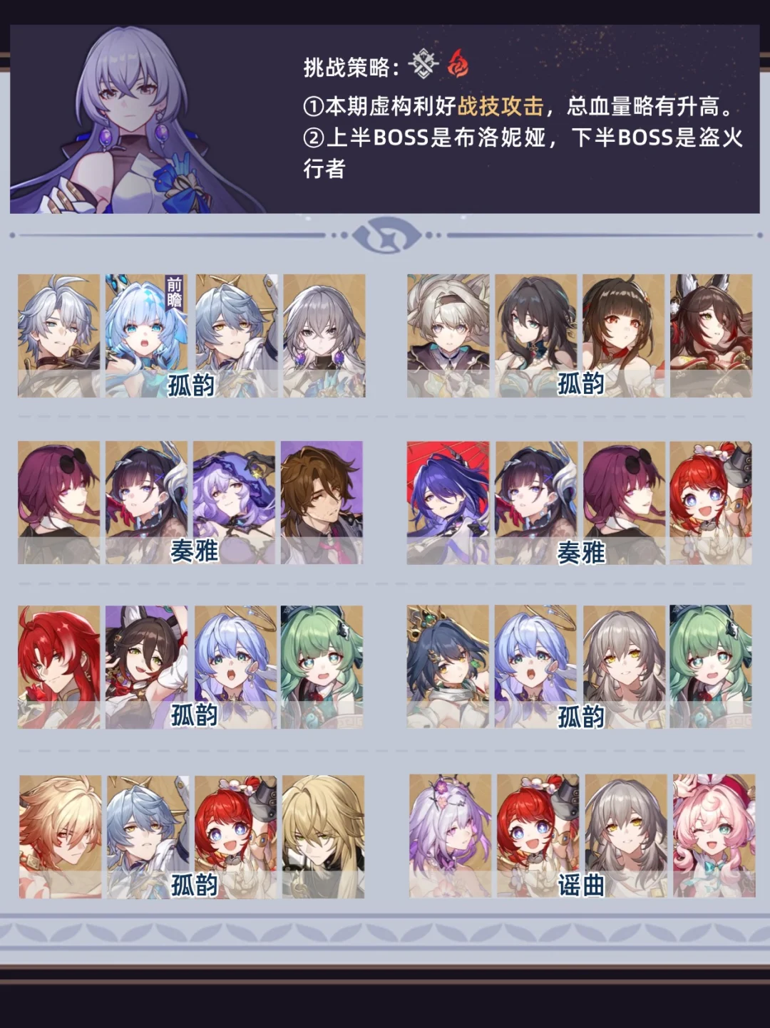 鼹鼠作业在手,虚构天下我有[doge] ▌09/01-10/13,速来码住抄作业啦[萌萌哒R] 🔍小tip: ① 本期虚构利好战技攻击,buff适用角色广泛 ② BOSS分别是布洛妮娅和盗火行者,水温较低 —————— ฅ՞• •՞ฅ ——————— 更多阵容推荐欢迎大家补充!我们下期再见👋🏻