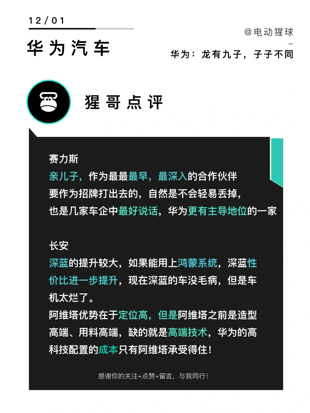 阿维塔优势在于定位高端,与华为契合,但是阿维塔之前是造型高端、用料高端,缺的就是高端技术,与华为合作也比较早,大家比较熟,华为的高科技配置的成本,长安只有阿维塔兜得住!