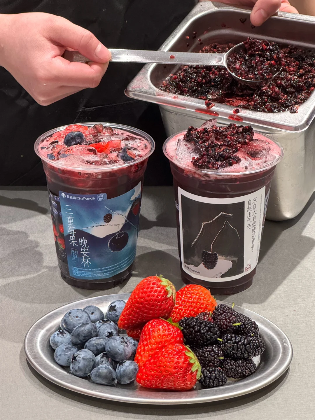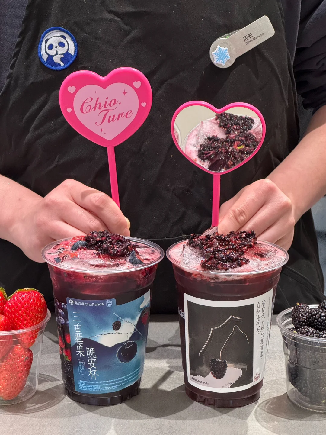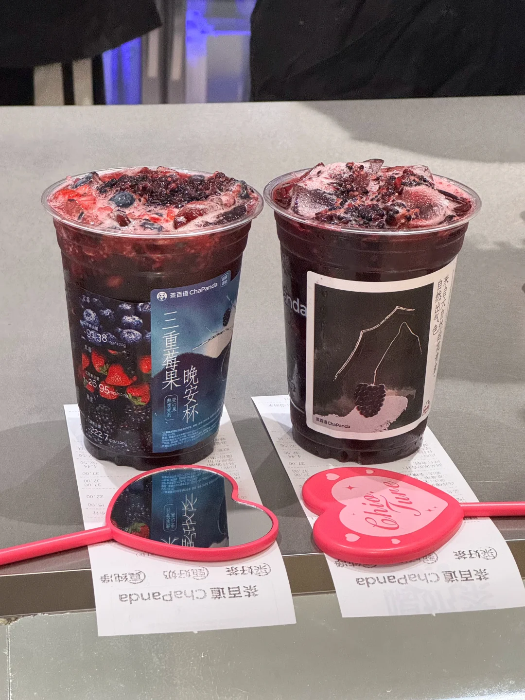 38女神节茶百道联名稚优泉~ 3.1-3.9买“茶逢稚己”单杯套餐送粉嫩嫩的手持镜 尊嘟好好看! 我要沦陷在桑葚新品里了!! ✔三重莓果·晚安杯 蓝莓🫐草莓桑葚三种莓果 每口都能吃到果肉~酸酸甜甜敲多维c一口爆汁 还有乌漆嘛黑!一直都期待这杯回归!满满一杯手拨桑葚 空口吃桑葚的快乐谁懂啊
