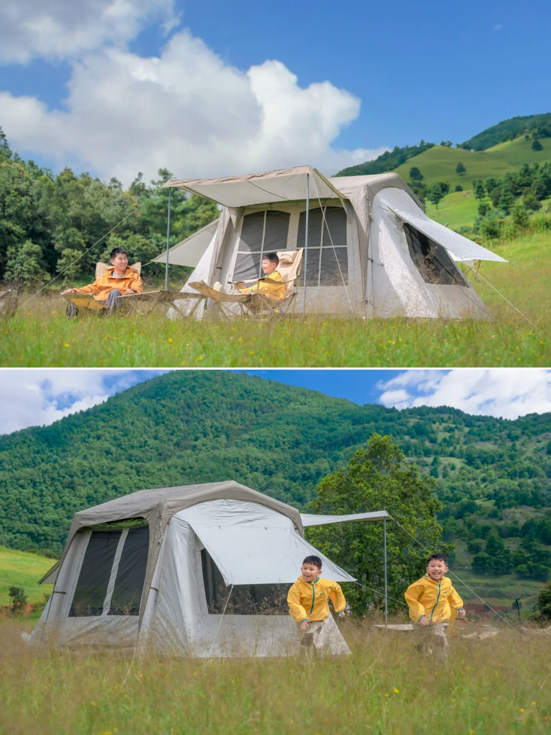 黑胶顶篷加涂银的帐身,夏天大太阳🌞底下里面也凉凉的。白天打开全景纱窗,通风透气;晚上盖上黑胶披顶遮风挡雨。上周末我带娃去山里露营,半夜下了场雨💦,早上起来帐篷里还是干干爽爽的,完全不用担心漏雨渗水。