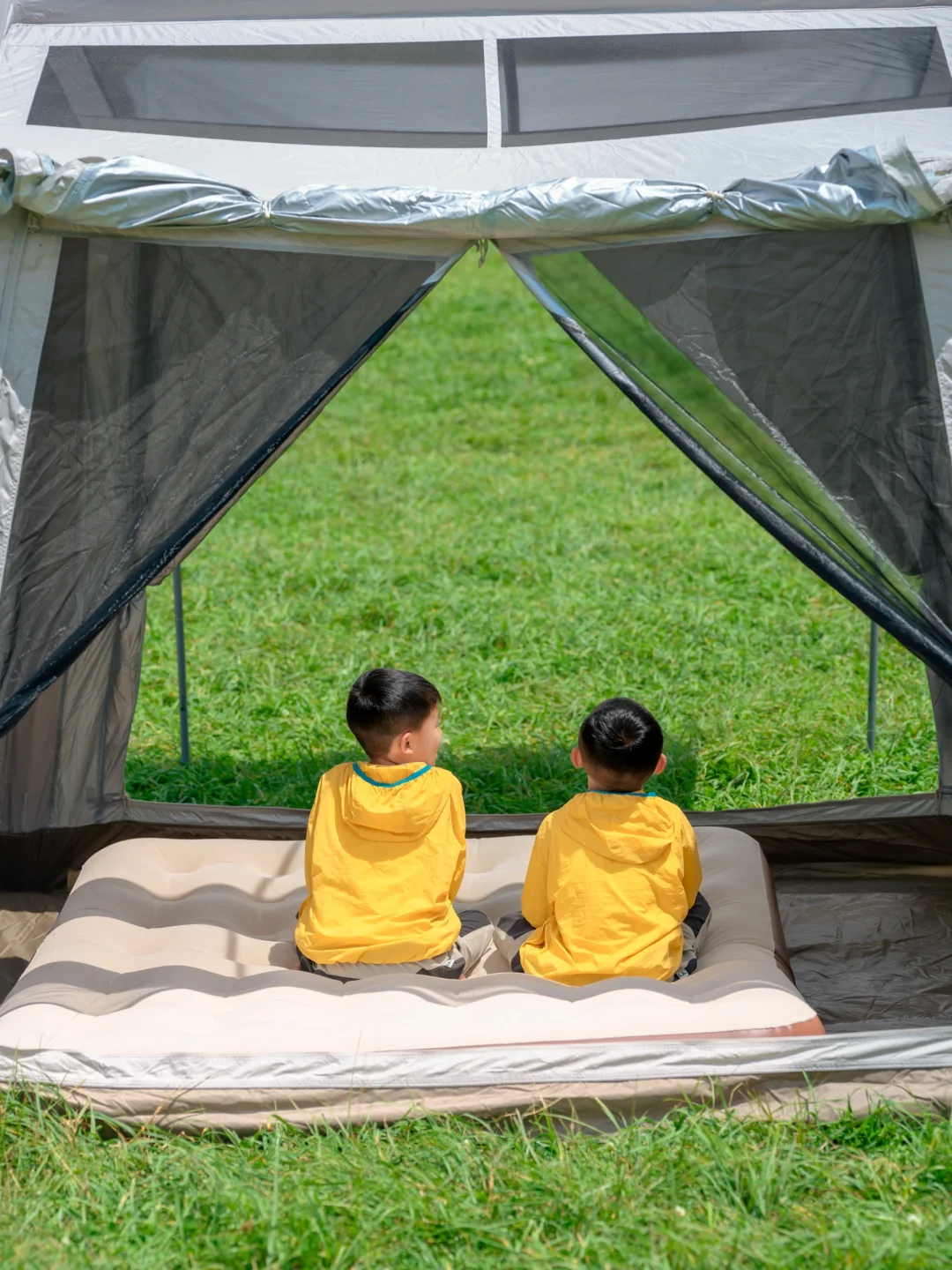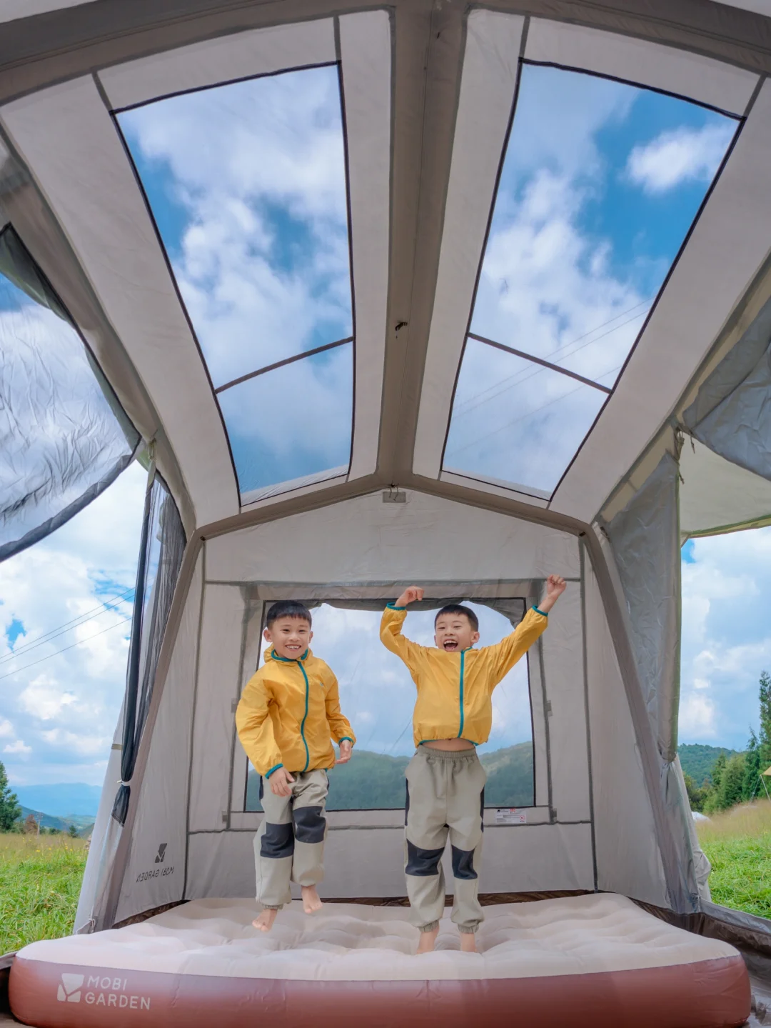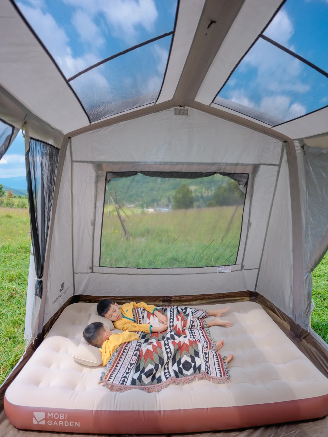 我家用的是⭐️牧高笛假日山居10.9充气帐篷,这款充气帐篷搭起来特别快速省心!气打进去,气柱鼓起来,3分钟就稳稳当当像个小房子一样。👏气柱很稳,娃在里面玩闹也不会歪倒侧翻,比市面上别的充气帐篷扎实多了。