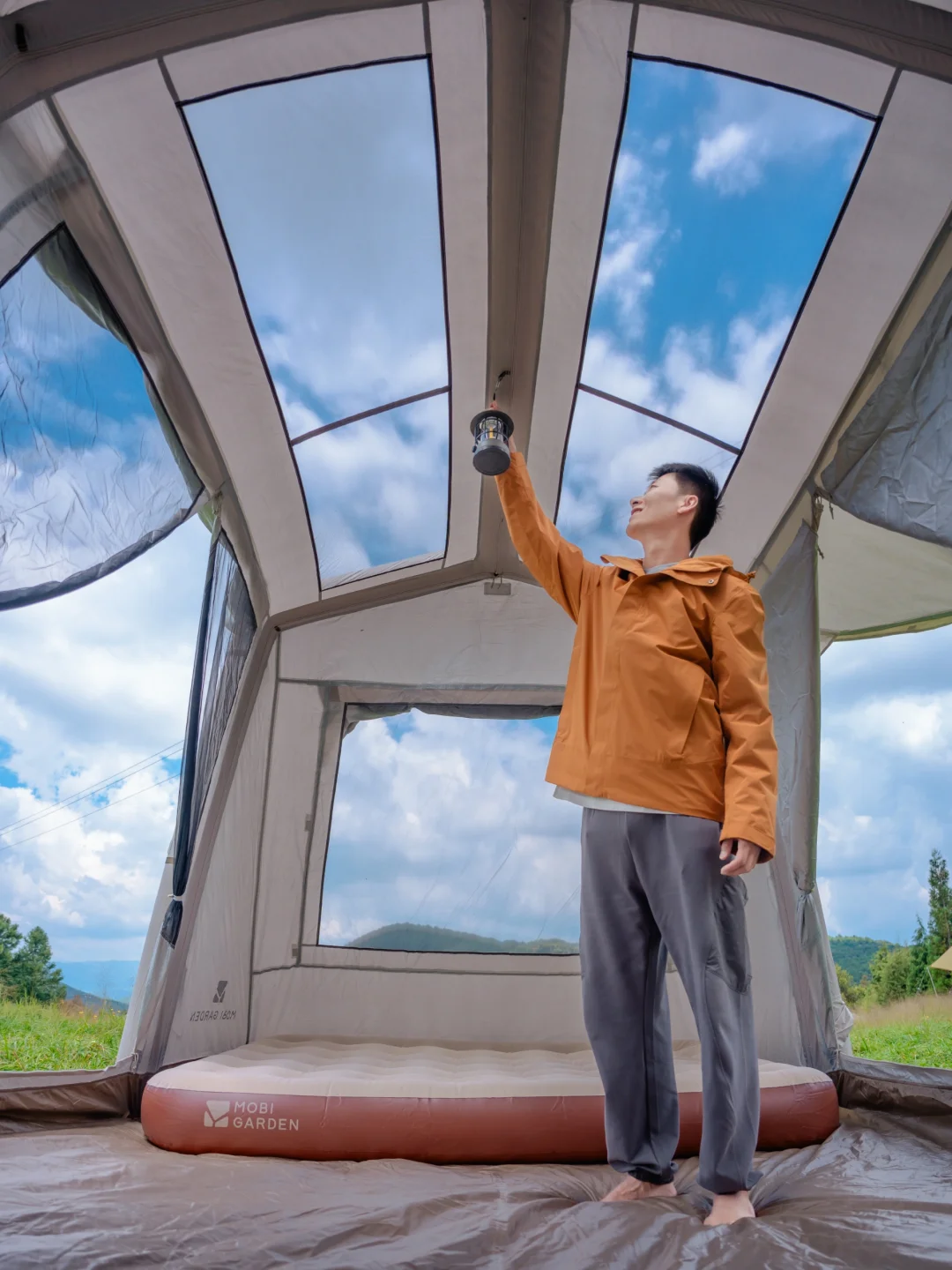 👍帐篷又大又敞亮,有10.9㎡,挑高2米1,我家两大两小活动一点不挤。我1米8的个头,在帐篷里挺直腰板走路也没问题!