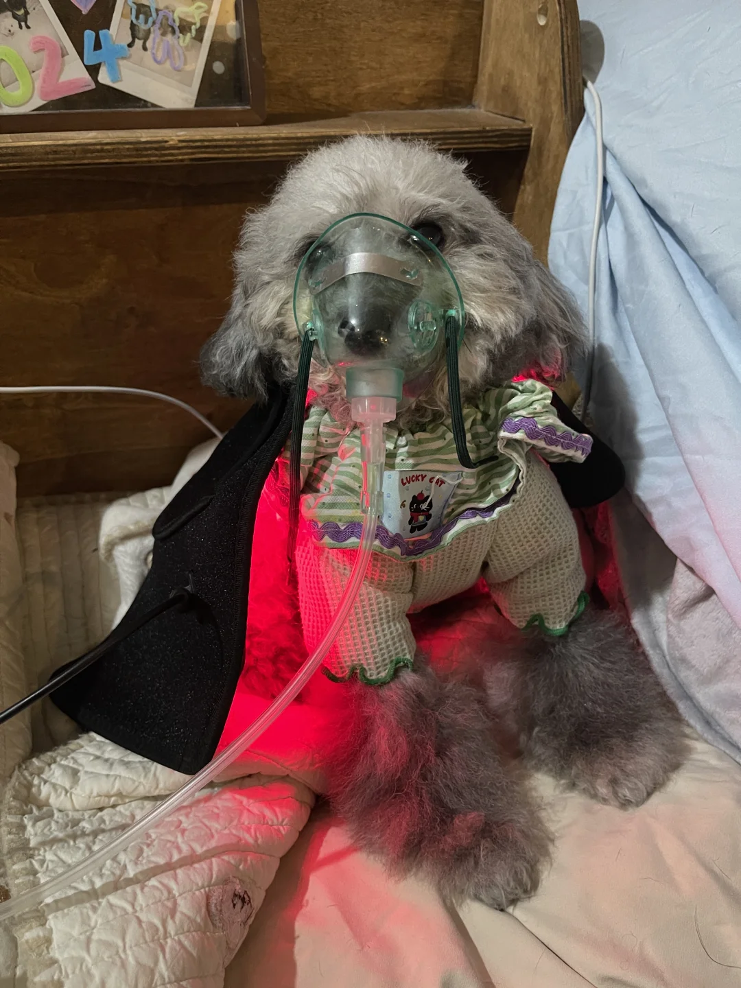 平时每天睡觉前都要在自己的小床上吸氧缓解咳嗽和气喘