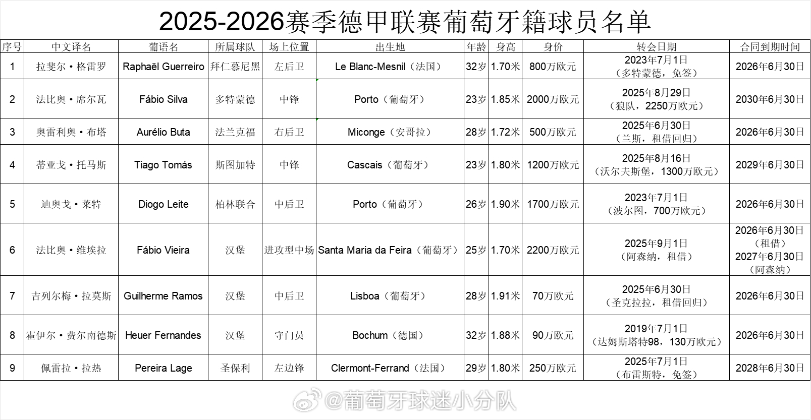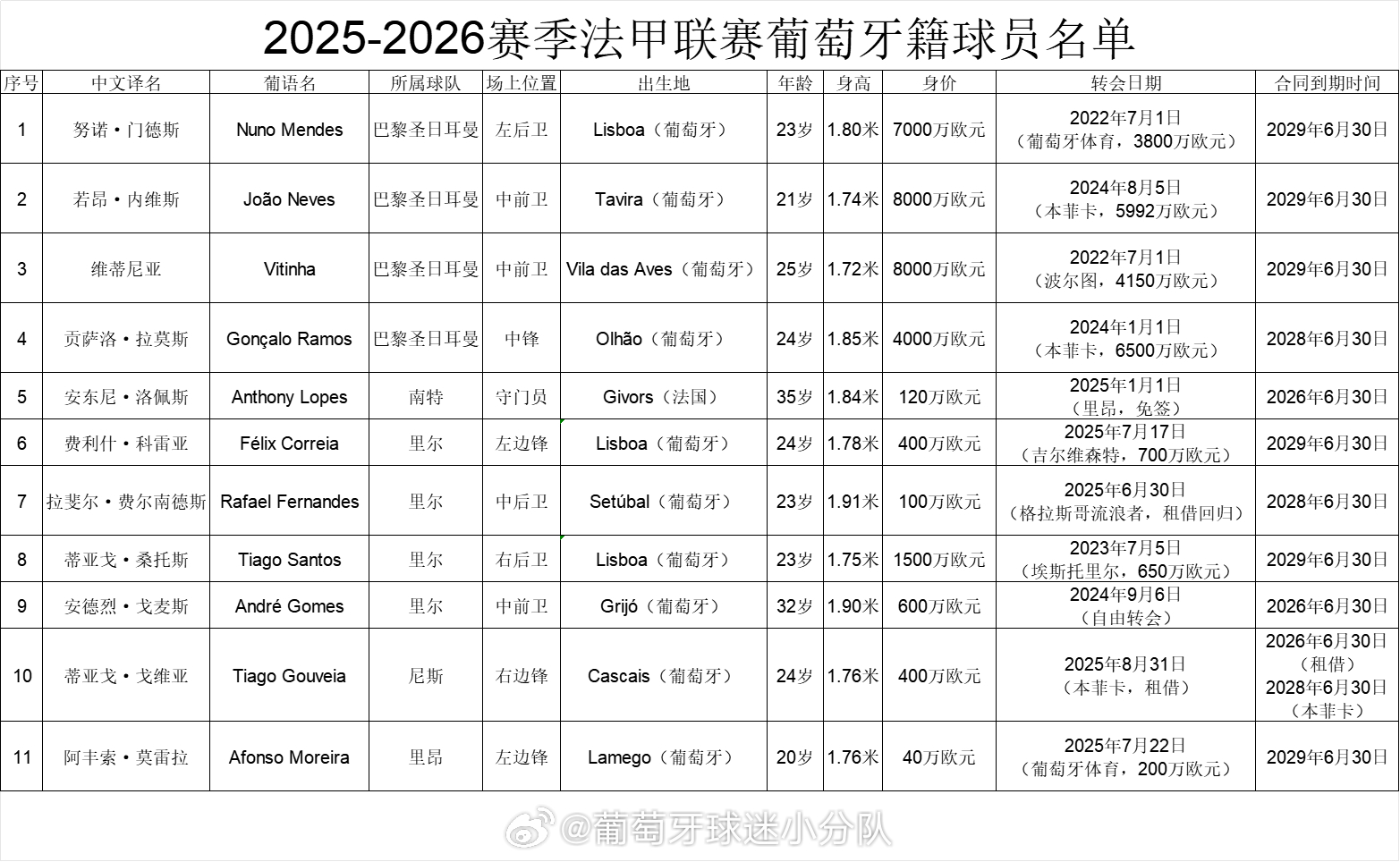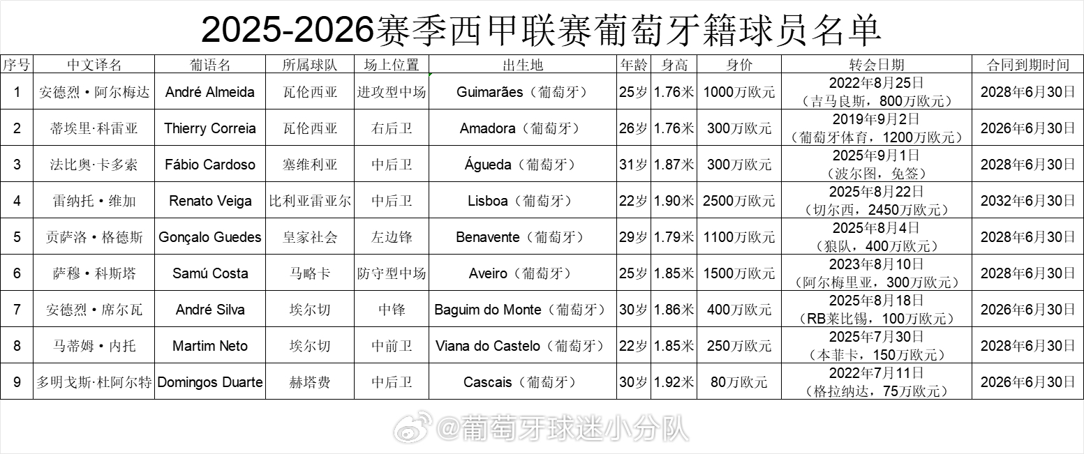 2025-2026赛季五大联赛葡萄牙籍球员名单