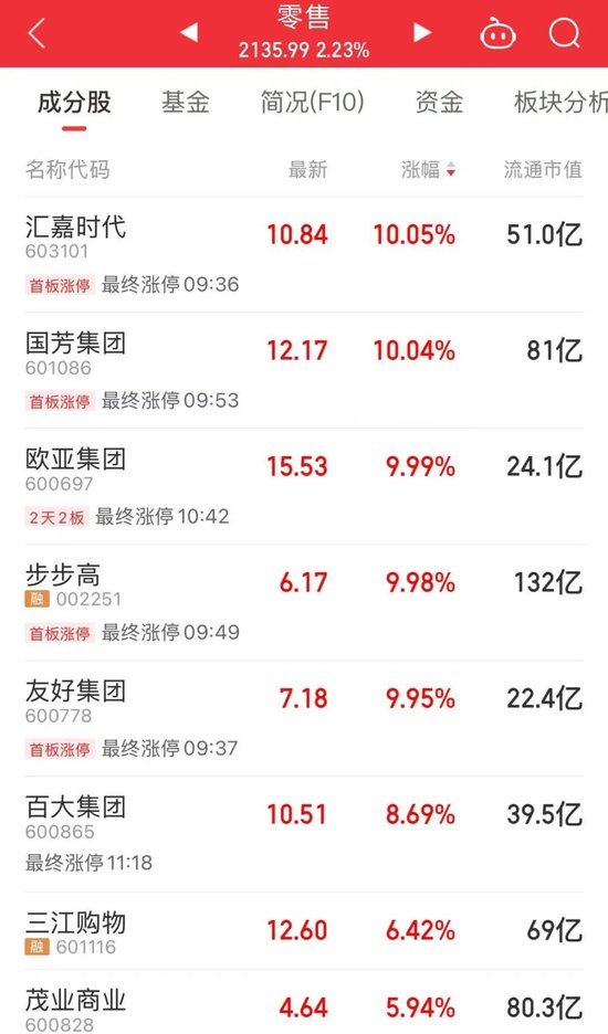 今天上午,新能源赛道和大消费赛道表现活跃。具体来看,大消费赛道走势较强,旅游酒店、零售、免税店等板块涨幅居前。汇嘉时代、国芳集团等多股涨停。