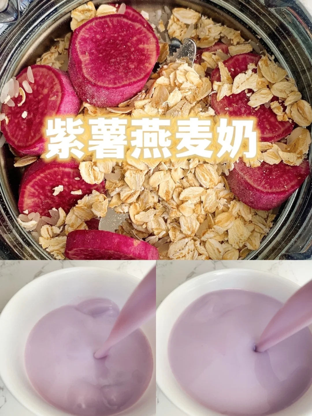 紫薯60g+燕麦15g+大米10g+水500毫升。选择破壁机豆浆模式,完成后加入牛奶250毫升和几颗冰糖颗搅拌均匀。