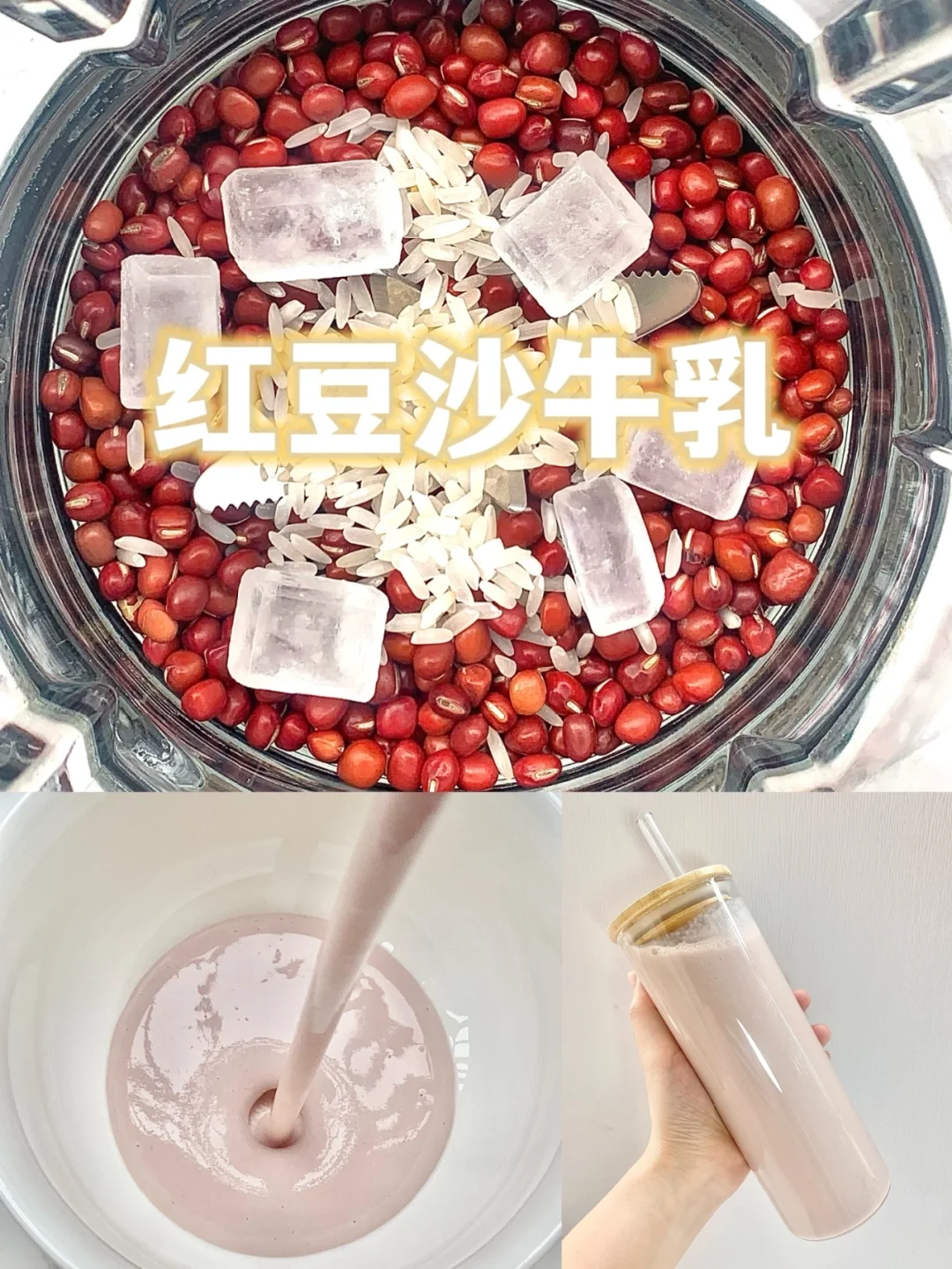 红豆50g+大米25g+水500毫升。选择破壁机豆浆模式,完成后加入牛奶250毫升和几颗冰糖颗搅拌均匀。