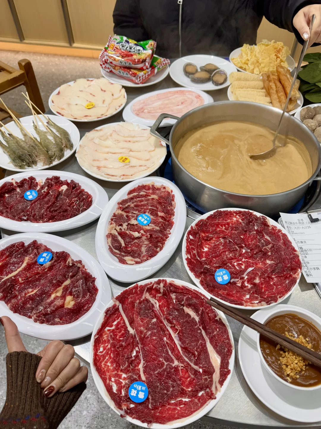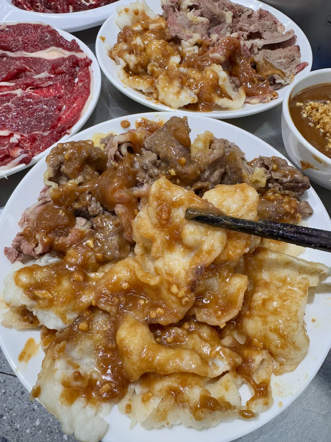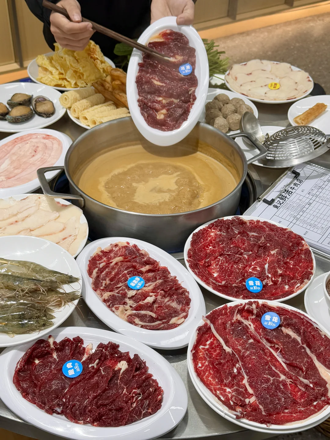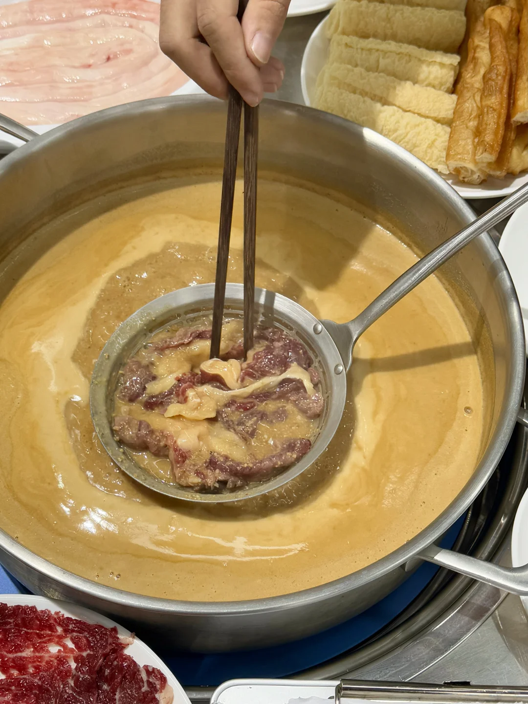网友真的很会推荐!终于在杭州吃到了正宗的沙爹牛肉火锅啊!!汤底ju浓郁啊!涮啥都好吃😭 明档鲜切吊龙、爽脆胸口油…蘸沙茶酱+金蒜谁懂啊!!谁吃谁爱!再来上一份蟹皇面 每根面条上裹满沙爹酱好入味啊!搭配劲道的手打牛肉丸🥹我和小伙伴kuku一顿炫~不乱说真的一个人吃了好几盘… 新鲜的牛骨髓吸溜一下进嘴里QQ弹弹 快去次!!! 还吃到了苦瓜牛肉蟹皇面!原来苦瓜和牛肉🐂这么搭喜欢苦瓜的冲这个❤️