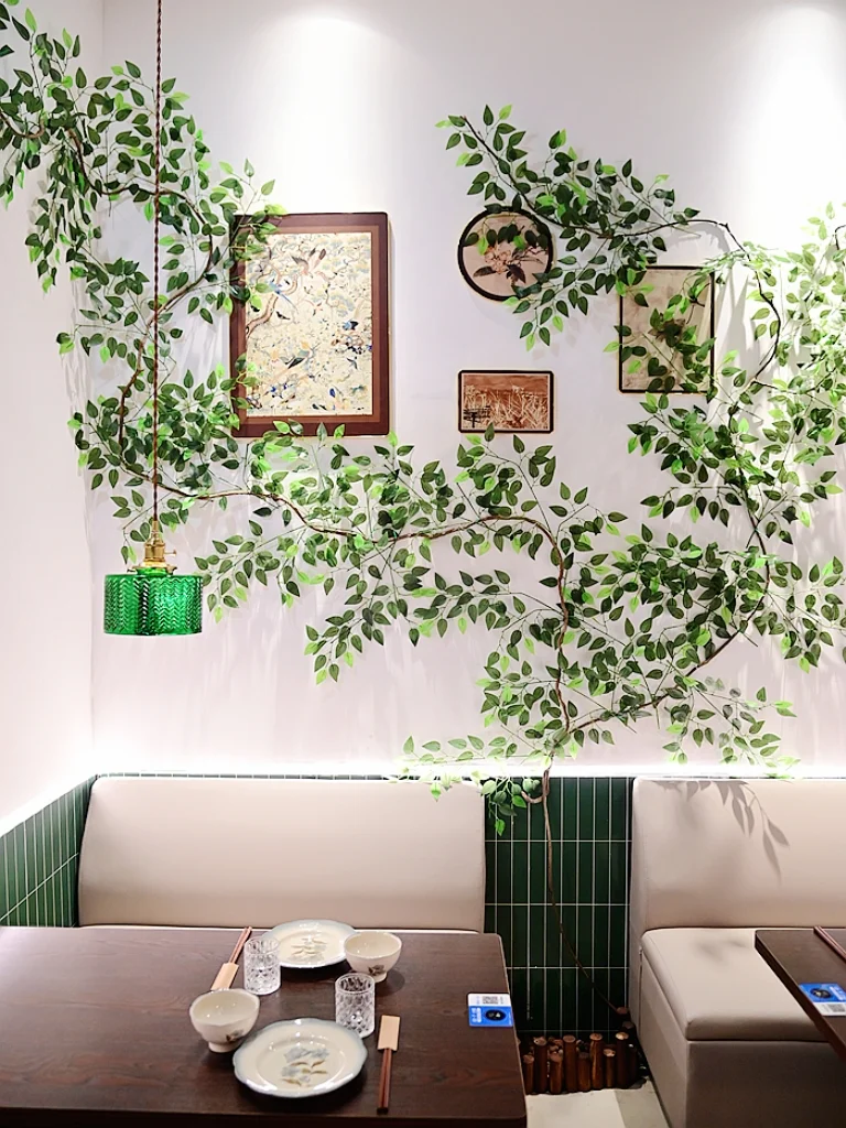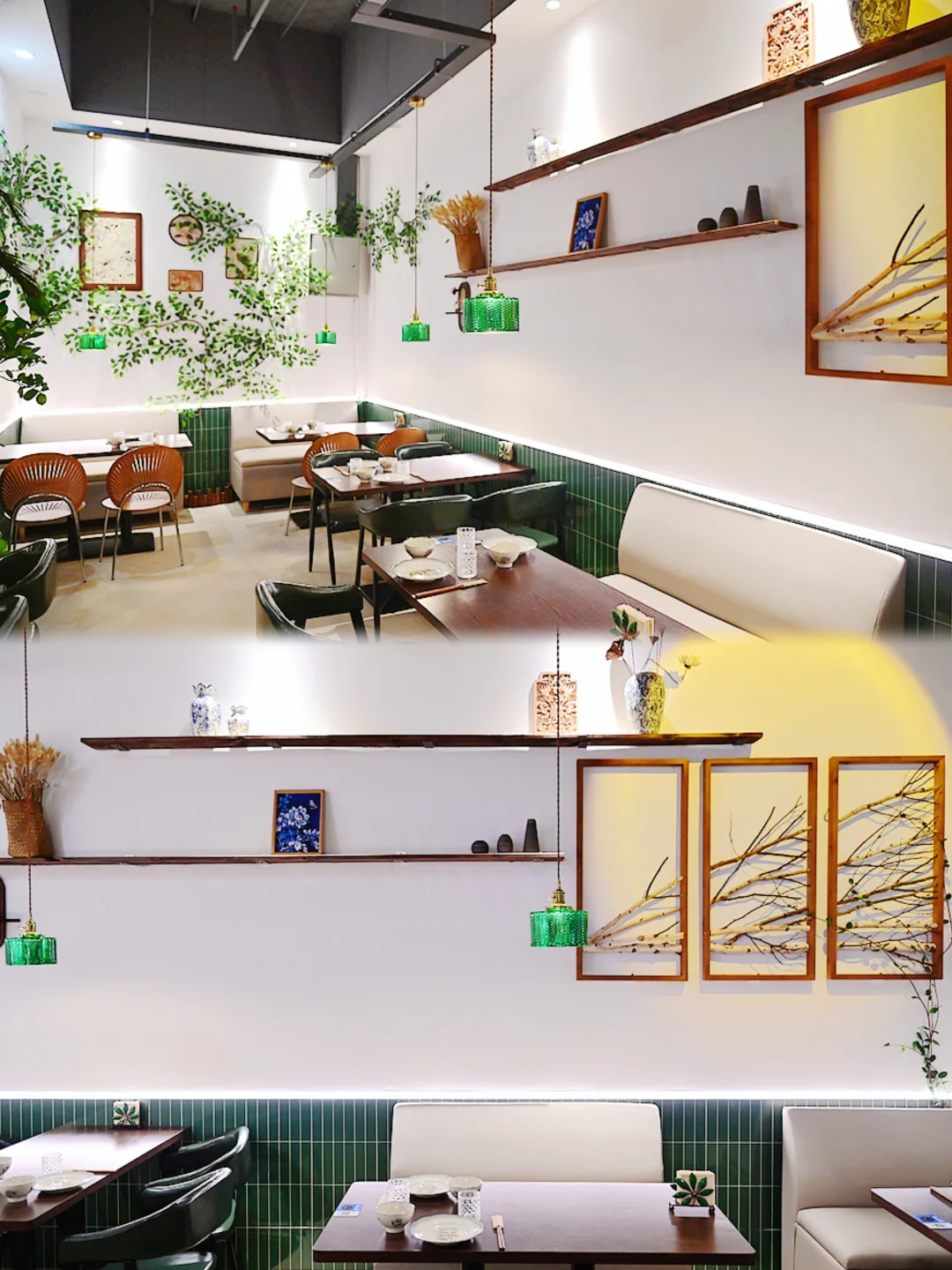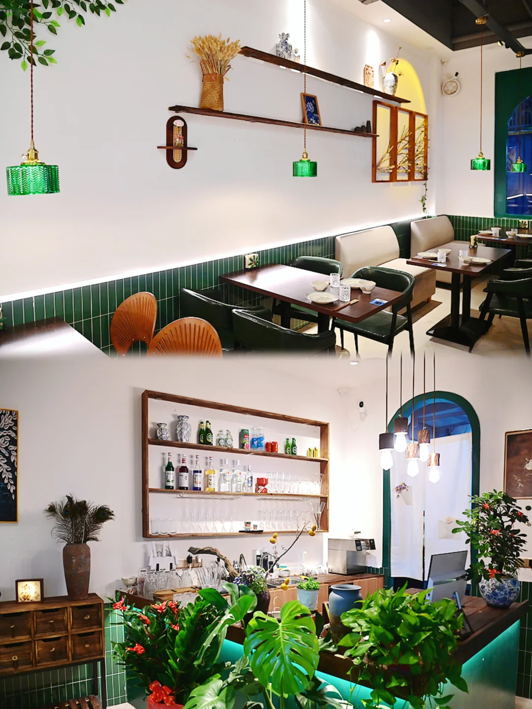🍀绿色的外墙春意盎然,大大的玻璃窗透出店里温暖的灯光,仿佛一个魔法小屋,引人入胜。推门进店,感觉闯入了森林草原里的秘密花园,鲜花绿植郁郁葱葱,画作艺术品错落有致,温暖灯光赏心悦目,桌椅舒适惬意放松,精美餐具古朴优雅,动听的爵士乐舒缓浪漫,氛围感十足,每个角落都好像童话场景,拍照很出片~🍃