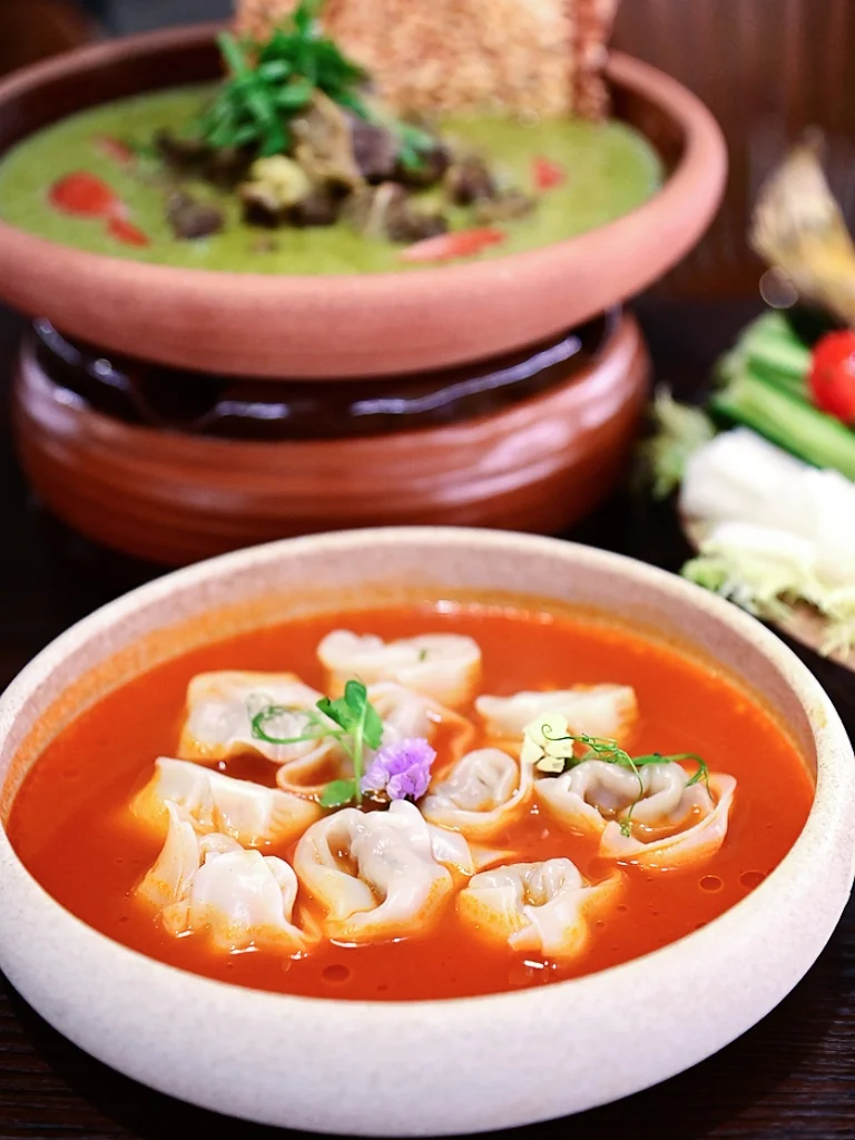 🍲贵州酸汤手工云吞,大颗洁白的云吞,红彤彤的酸汤,点缀着小花绿芽,美轮美奂。云吞皮薄馅足,灵魂酸汤酸爽开胃,连云吞带酸汤整碗吃光光!