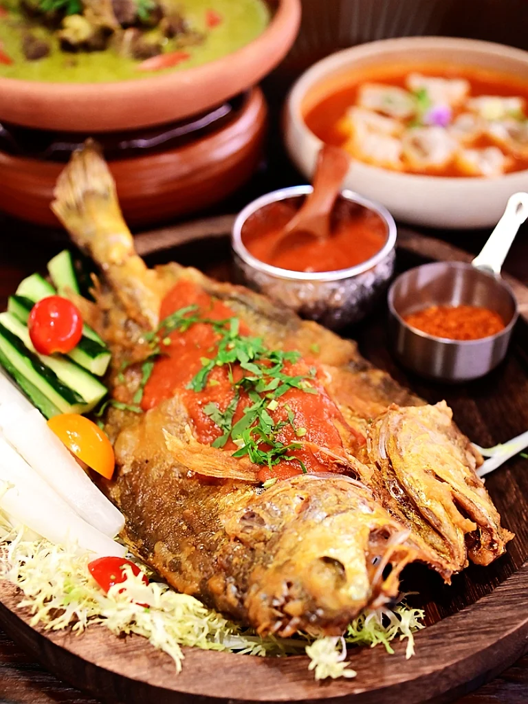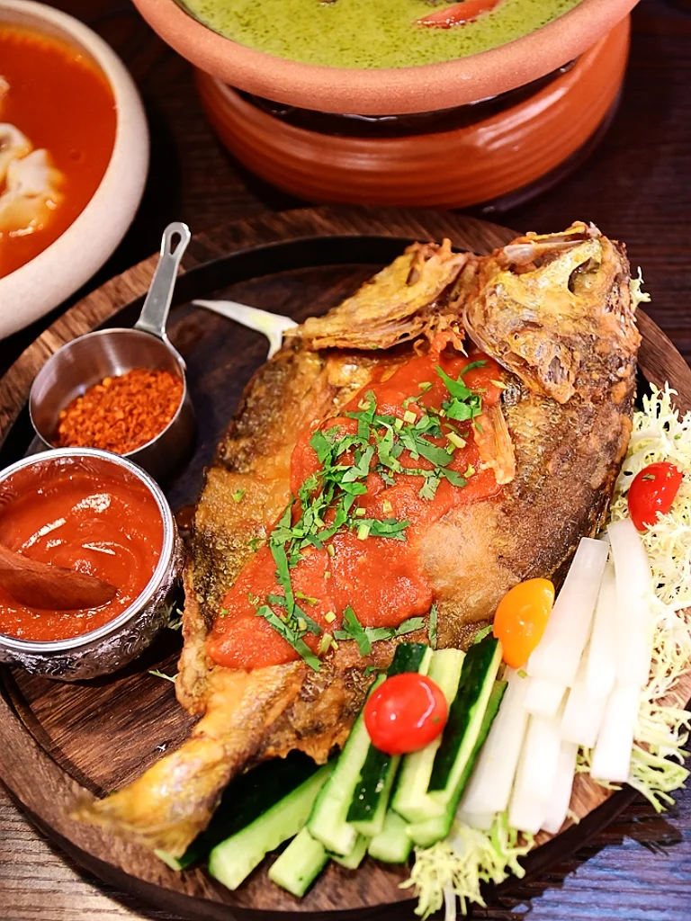 🐟喃咪酱香茅烤鱼, 整条鱼烤的金灿灿香气四溢,火候恰到好处,香酥而不老,细嫩而不生,连鱼骨都香喷喷嘎嘣脆,搭配番茄喃咪酱和蔬菜,爱不释手!