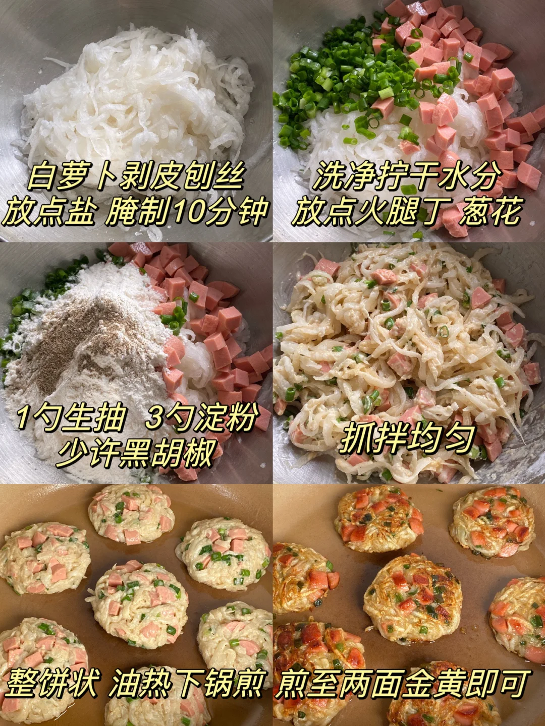 今天分享的是香煎火腿萝卜饼,巨好吃😋 外皮酥脆,内里软糯,咬一口满嘴都是萝卜的清甜,还有火腿的咸香,满满的幸福感[派对R],好吃不月半,一上桌就秒光!快去做起来吧。 食材:白萝卜 火腿 葱花 淀粉 做法简单,步骤看图集👆