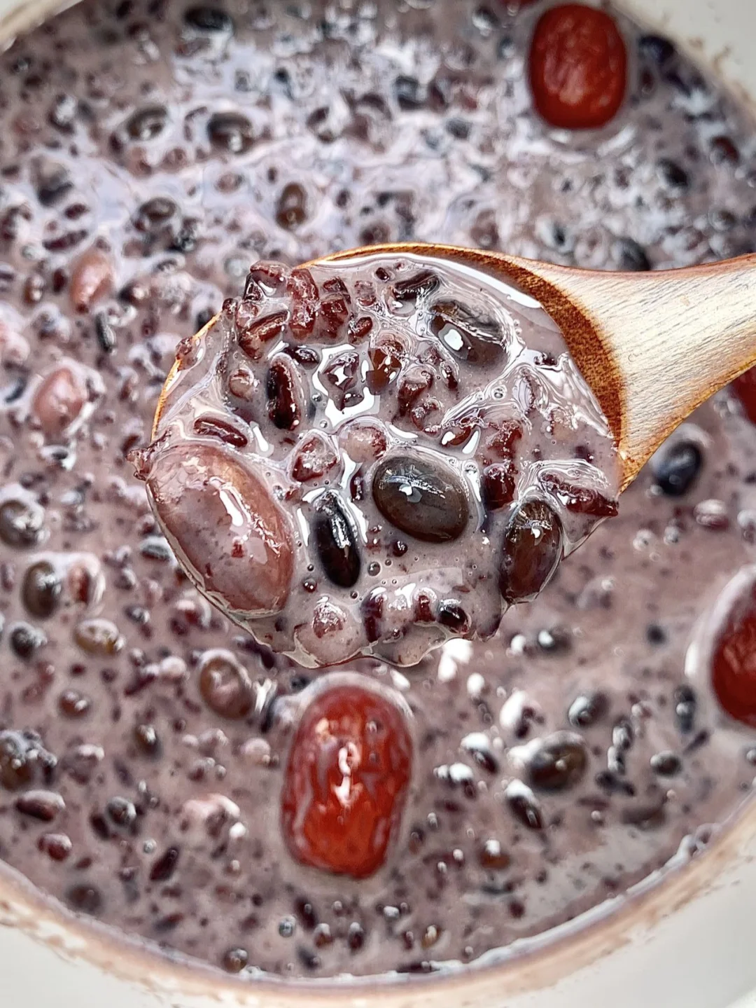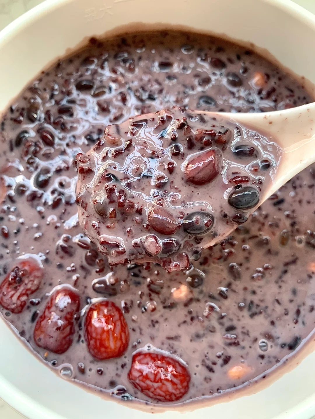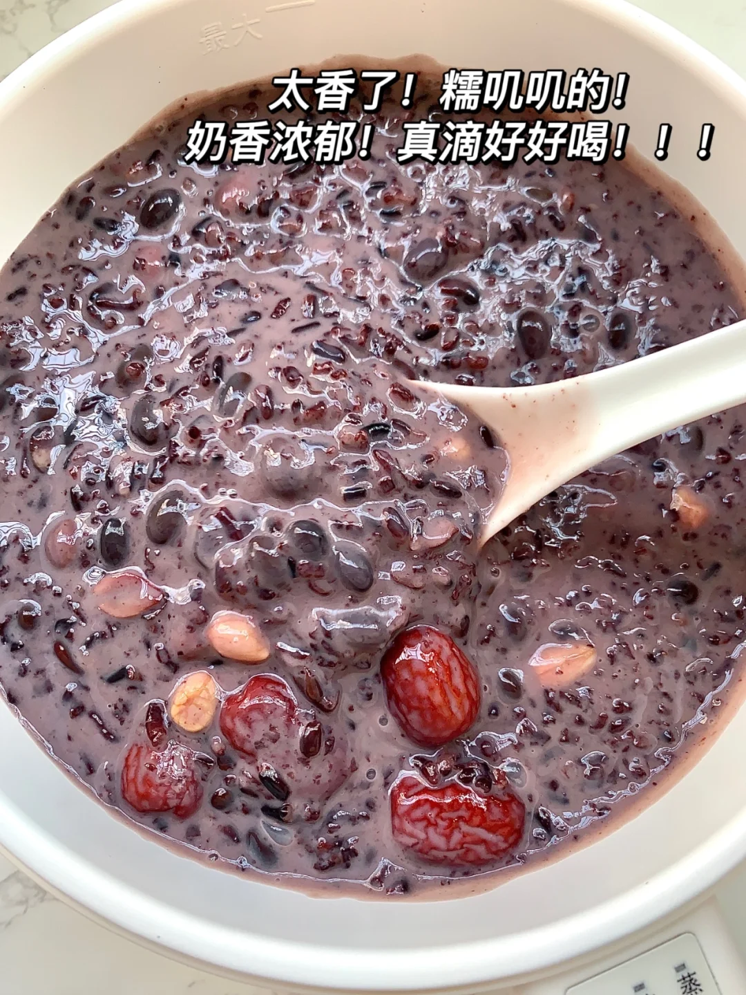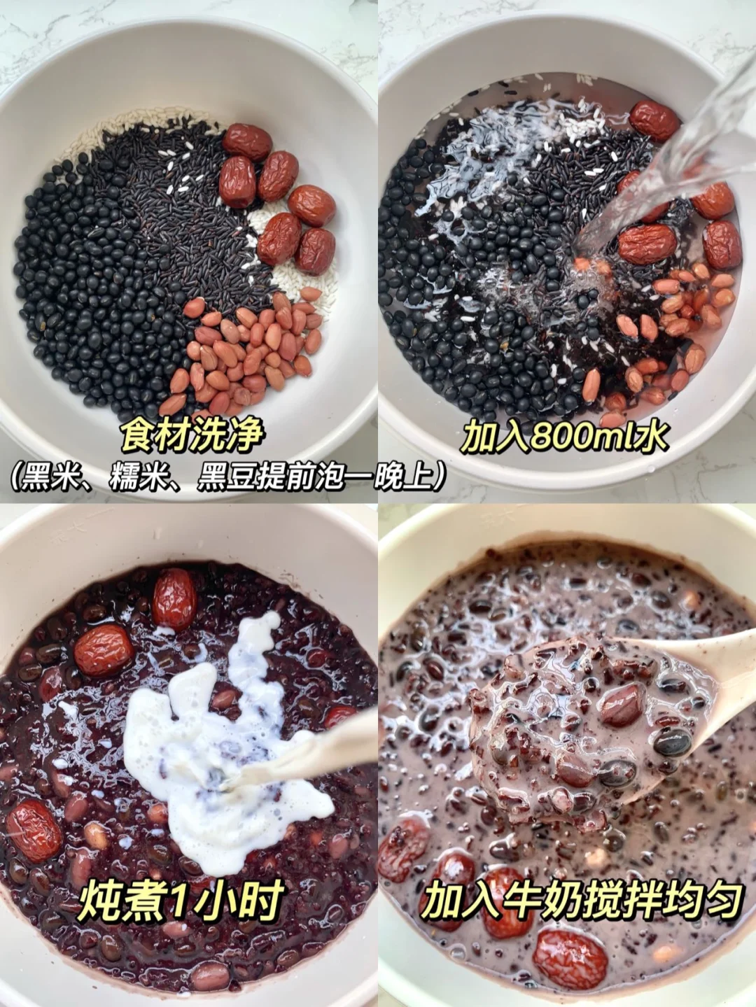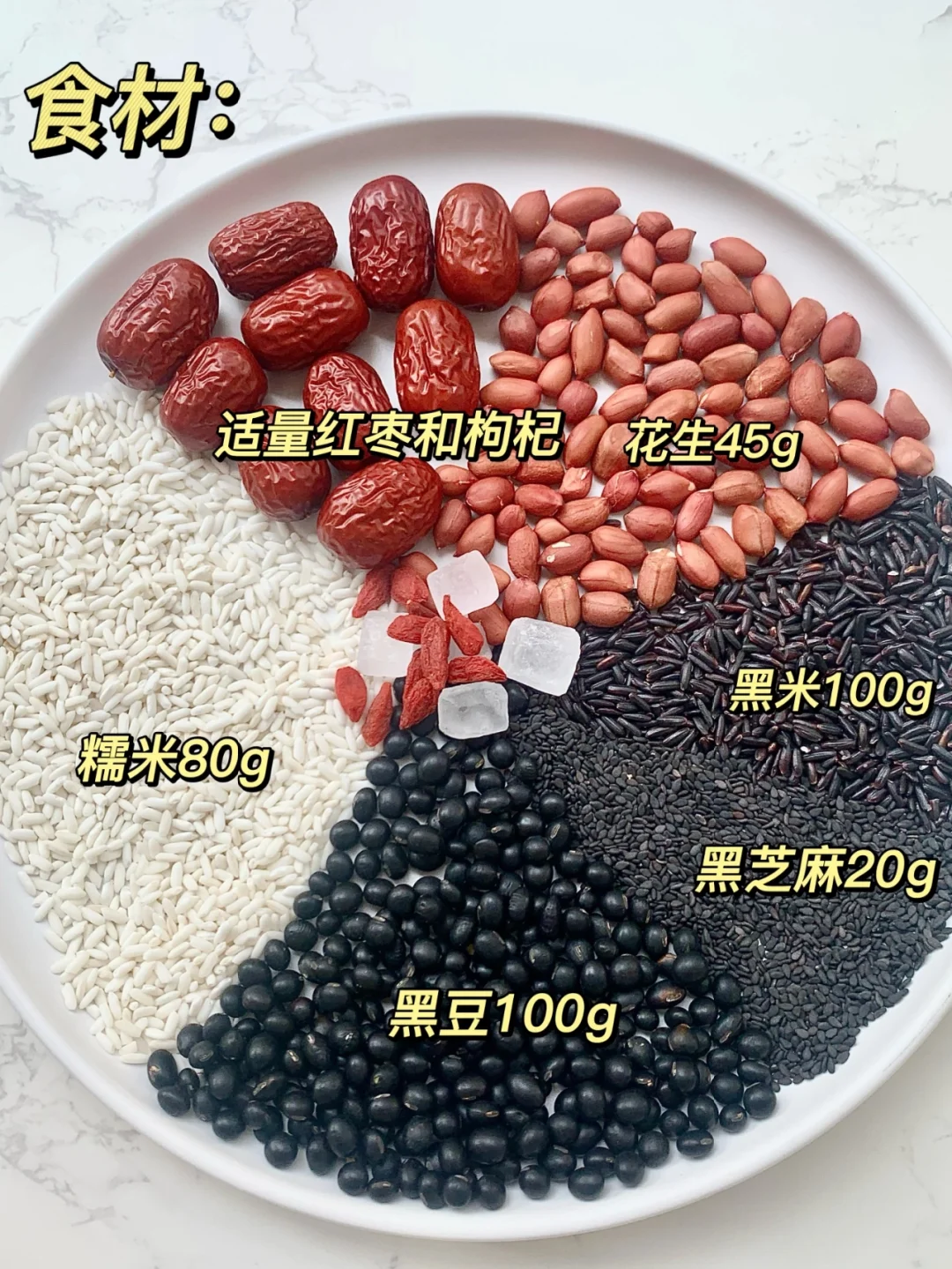✅食材:黑米100g、糯米80g、黑豆100g、黑芝麻20g、花生45g、红枣8颗和适量枸杞和冰糖