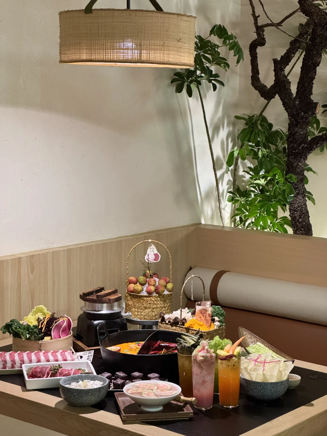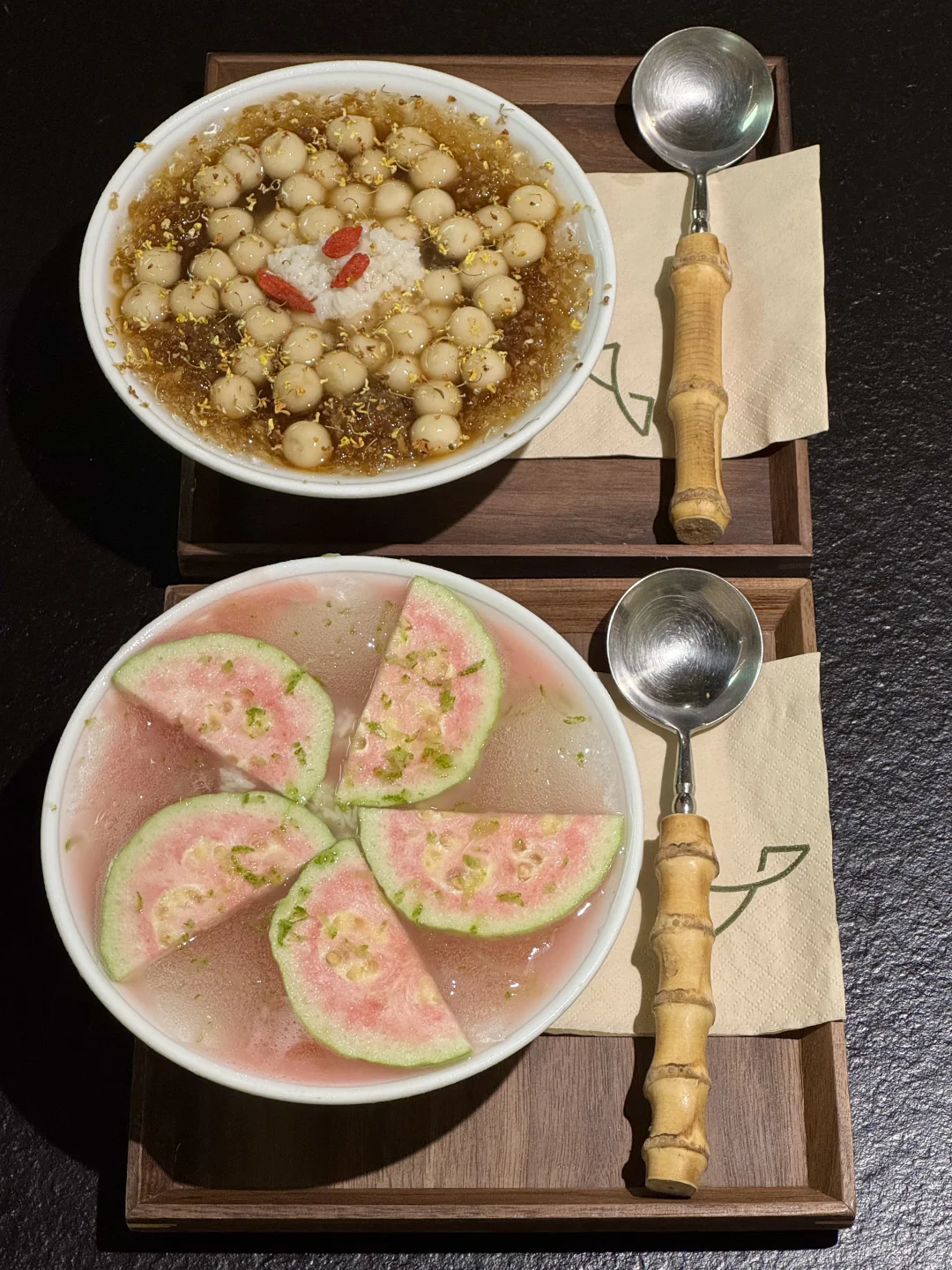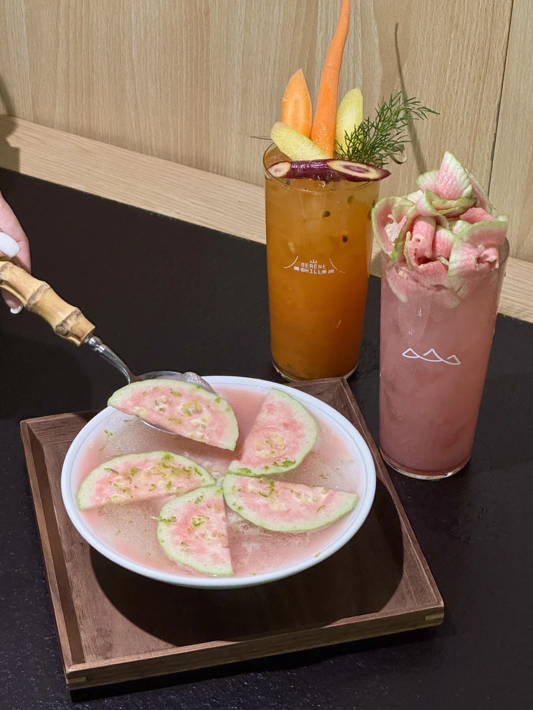 山缓缓可以算得上是杭州我坠爱❤️的火锅店!排队也要吃的!!😭😭 🆓的老白茶和新鲜荔枝!还有芭乐气泡水、苦瓜气泡水、胡萝卜百香果汁🥕他们家的小甜水也是好看又好喝!冰冰凉凉的芭乐酒酿冰粉好清爽和火锅好搭~边吃边约下次什么时候来了!! 我们点了野果酸汤锅底🍲酸酸辣辣的好开胃 新鲜现切的木姜子牛肉、花桂牛肉🐂放心点涮乐山红汤锅底里嘎嘎香! 还有外酥里糯的黑米糍粑、松软的麦青红豆糕(吃完又打包走了两盒🤤)现焖的芽菜脆哨牛肉饭🍚盲点都好吃不踩雷~