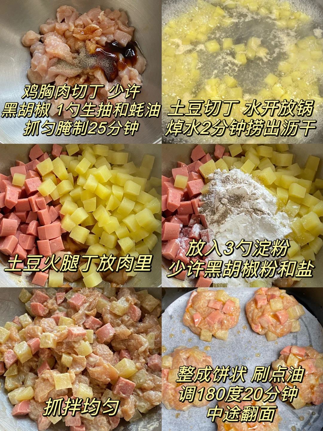 今天分享的是空气炸锅做的土豆鸡肉饼,巨好吃! 外酥里糯,香脆可口,撒点辣椒粉,每一口都嘎嘎好吃!土豆沙沙糯糯,鸡胸肉焦香多汁,加了火腿丁味道真的绝了,低卡又饱腹,喜欢吃的姐妹快来做做吧! 食材:鸡胸肉 土豆 火腿肠 淀粉 做法简单,步骤看图集~