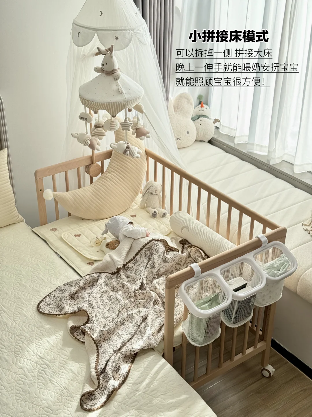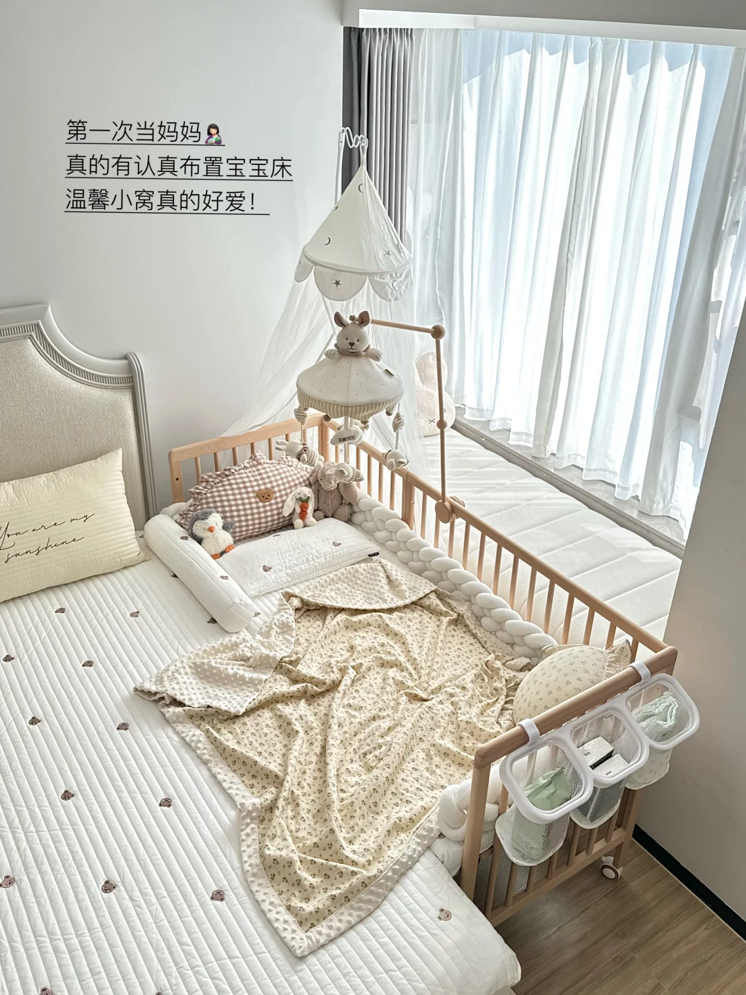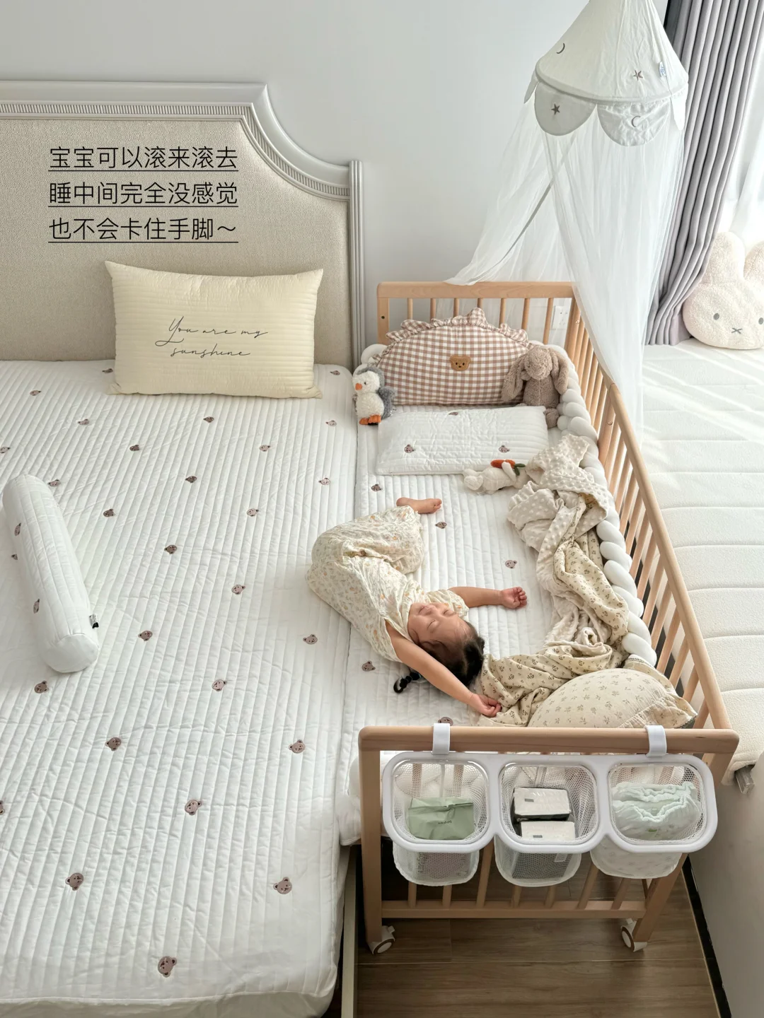 宝宝睡小床,我们睡大床,互不影响又好照顾宝宝,半夜喂奶🍼也很方便~