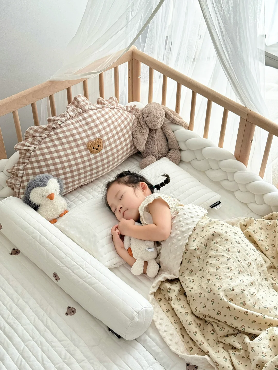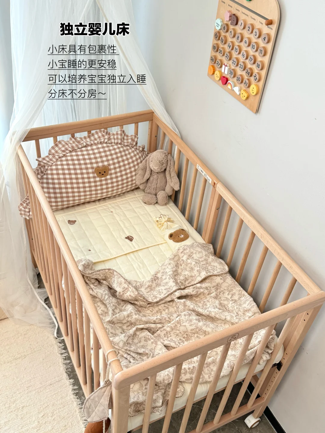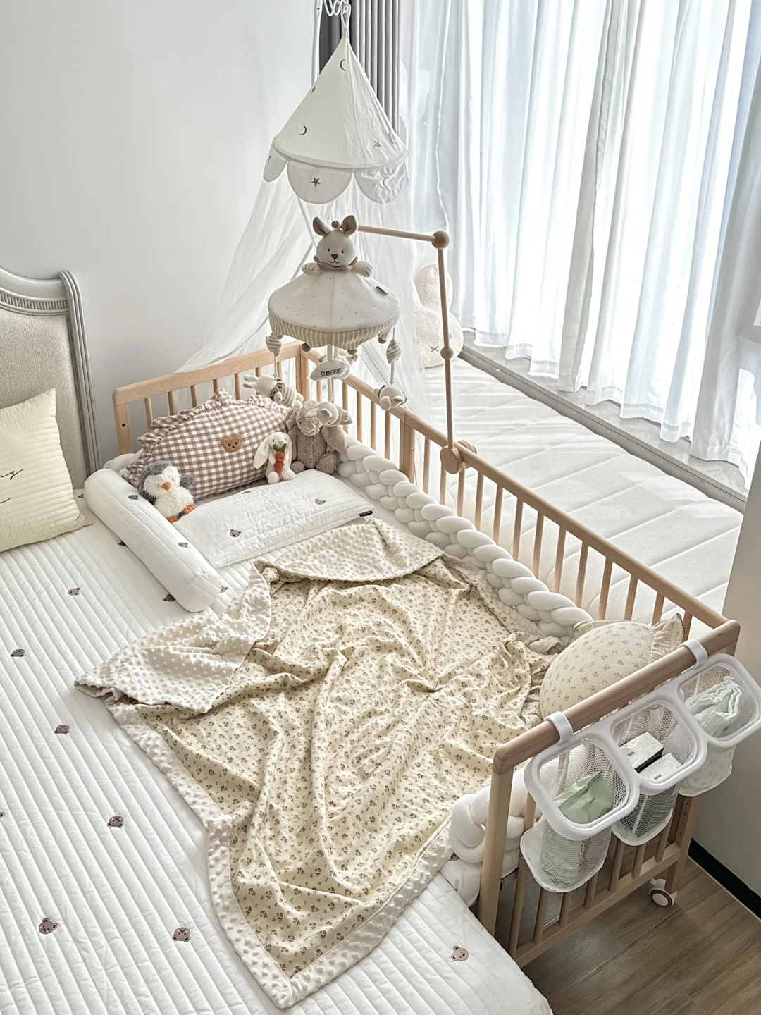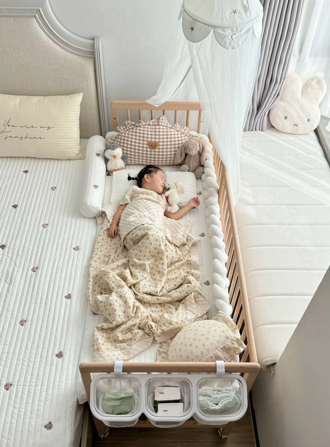 宝宝睡小床,我们睡大床,互不影响又好照顾宝宝,半夜喂奶🍼也很方便~