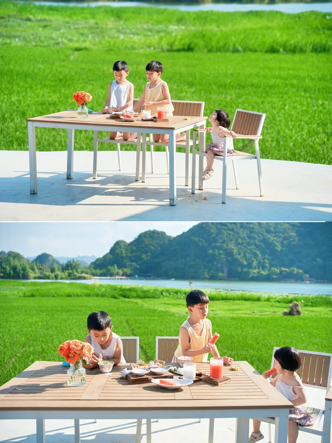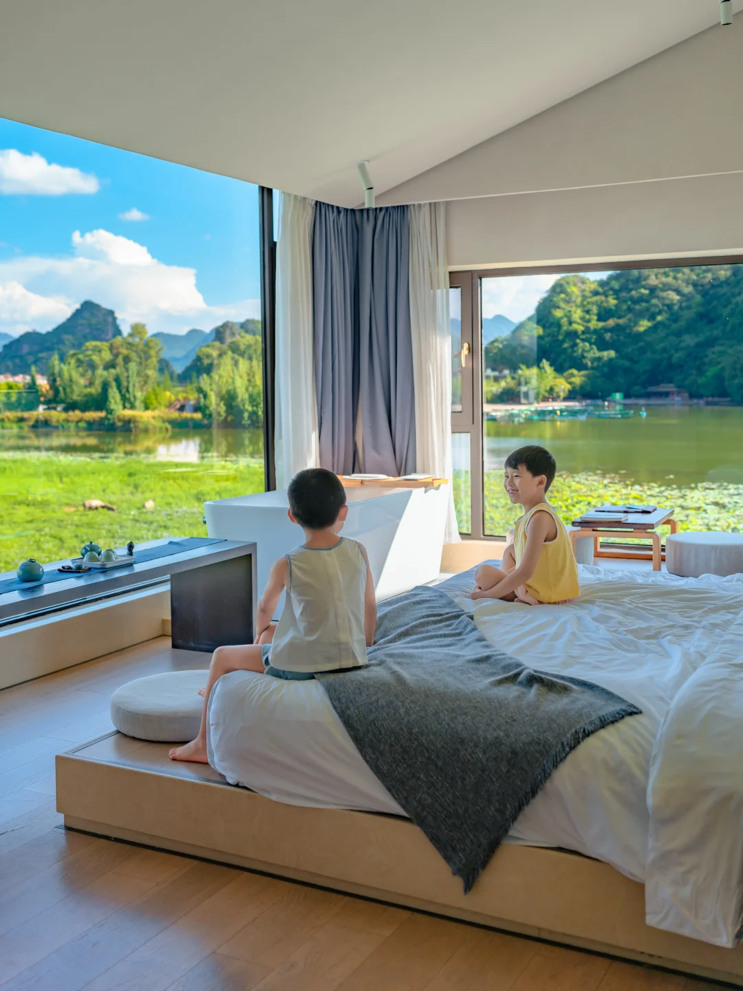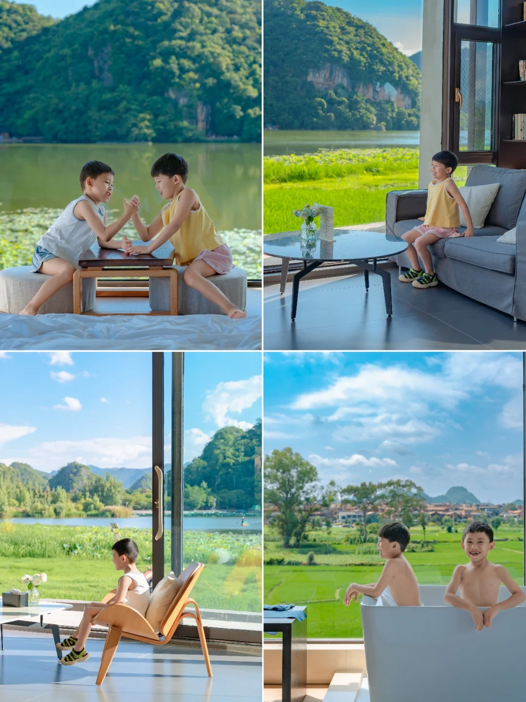🌳大大的落地窗外外面,是连绵的青山、无边的稻田、大片的荷塘。看小船悠悠划过,水牛慢悠悠吃草…