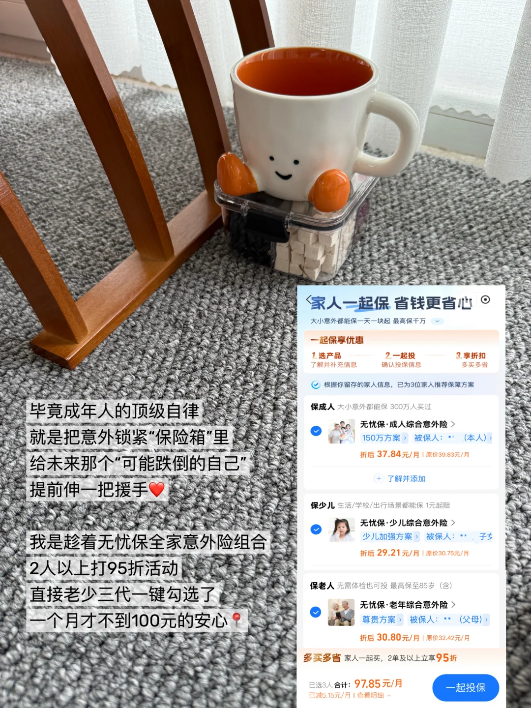 我是趁着无忧保全家意外险组合2人以上打95折活动,直接全家组团,把老少三代一键勾选全买了。