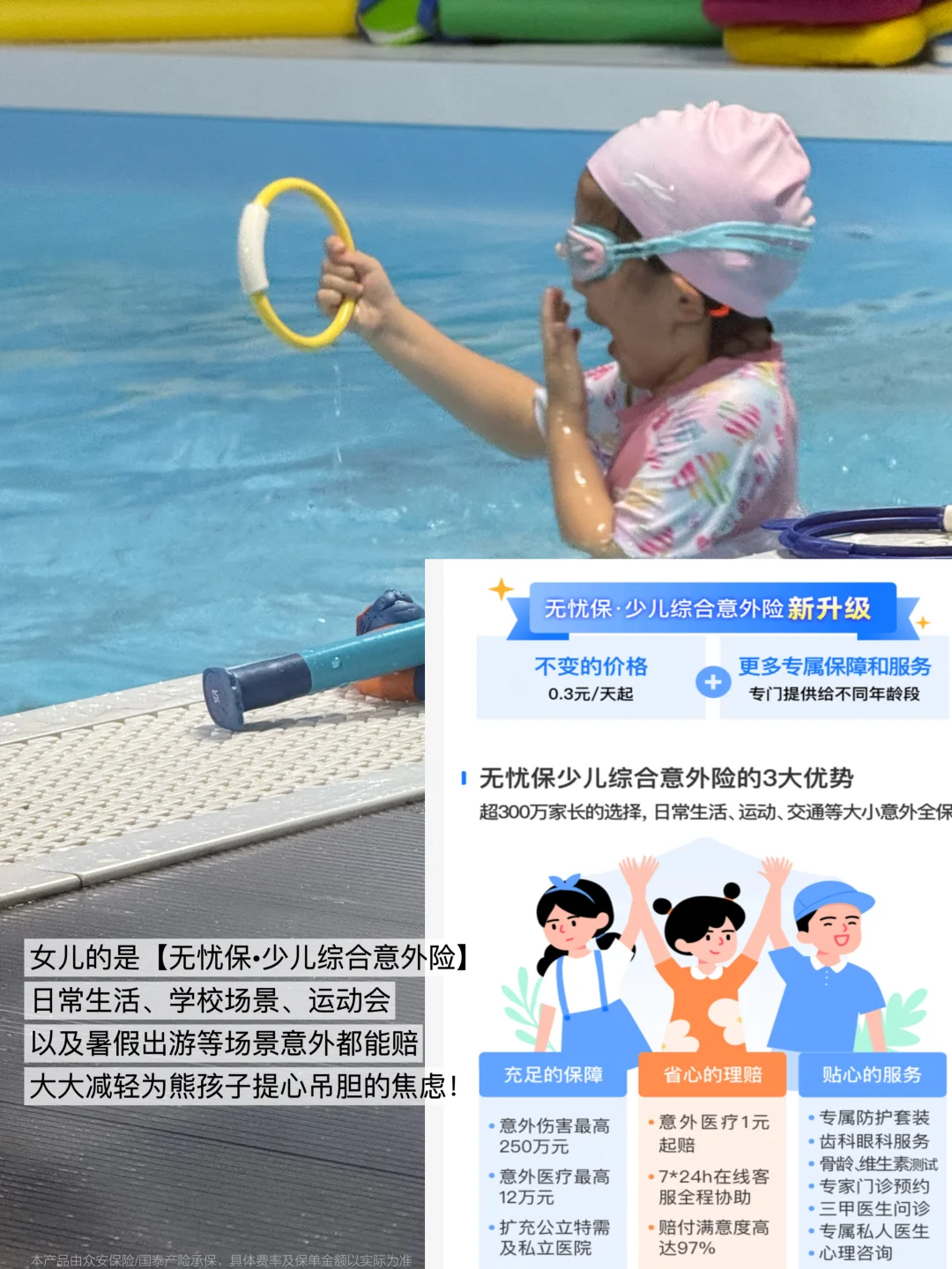 女儿的是【无忧保·少儿综合意外险】,保的也全。日常生活、运动会以及暑假出游等场景意外都能赔,大大减轻为熊孩子提心吊胆的焦虑!