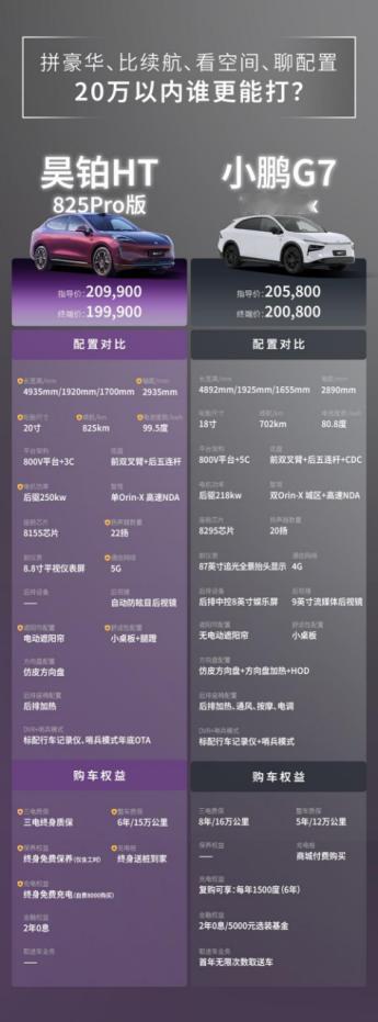 一款真正优秀的家庭用纯电SUV,不仅要满足日常通勤,更要在长途自驾中表现出色。从这个角度说,昊铂HT无疑是一款设计全面且贴心的车型,对比之下,小鹏G7则显得稍有遗憾。长途出行时,续航里程是影响体验的决定性因素。昊铂HT作为20万内唯一双800车型,以99.5kWh的大容量电池,实现了825km的超长续航,这意味着在跨省自驾时,你需要停下来充电的次数更少。而它搭载的800V平台+3C快充技术,也保证了每次补能都更迅速。同时,官方还附赠终身免费充电权益,用车成本进一步降低。而小鹏G7的续航里程仅为702km,电池容量较小,再加上市面上能支持5C快充的充电桩数量有限,导致实际使用中的便利性大打折扣。不仅跑得远,昊铂HT还把舒适性做到了极致。它的车长4935mm、轴距2935mm,为后排乘客提供了宽敞的活动空间。无论是带娃出游还是商务接待,它的143°可躺平天王椅设计、小桌板与腿蹬都能让乘员得到充分放松。而相比之下,小鹏G7的后排因轴距2890mm的限制,舒适性略显不足,储物能力也无法满足家庭用户多场景的使用需求。此外,昊铂HT在豪华配置上的越级表现也令人印象深刻。标配Nappa真皮座椅、电动遮阳帘、22扬声器音响系统,影音享受与舒适性兼具;8155芯片和5G网络的加入,更是让车机操作流畅自然。而小鹏G7的8295芯片虽表现不错,但缺失遮阳帘等实用性配置,尤其在夏季用车时,后排乘客的体验容易受到影响。最后来看购车权益,昊铂HT目前终端售价仅为19.99万元,还推出了9月独家福利——下订最高可获得5999元购车补贴,同时享受三电终身质保、整车6年/15万公里质保及终身免费保养服务。这种覆盖购车全周期的优惠政策,直接减轻了用户的后顾之忧。而小鹏G7虽然提供价值1.2万元的礼包,但在长期用车成本上的帮助较为有限。总的来说,无论是长续航、高舒适性,还是售后保障,昊铂HT都展现出了全面的产品力。如果你正在寻找一款适用于多场景的家用纯电SUV,昊铂HT将是你的理性之选。 广汽昊铂HT18万级纯电SUV对比没输过 20万内唯一续航补能“双800”纯电大五座SUV