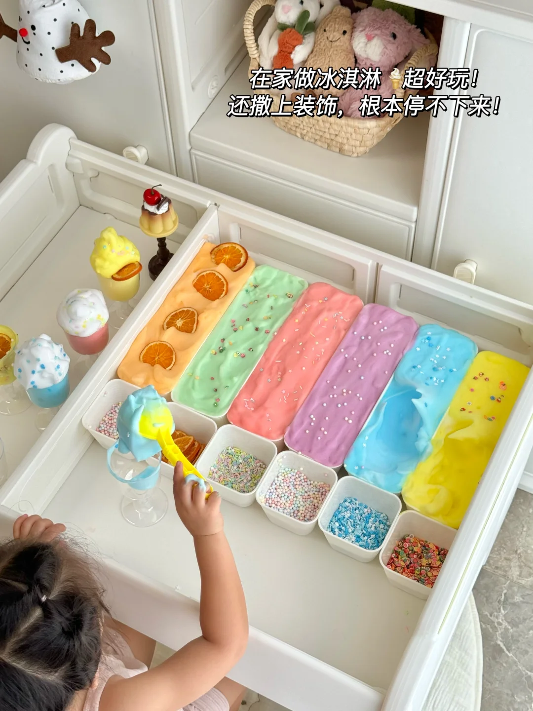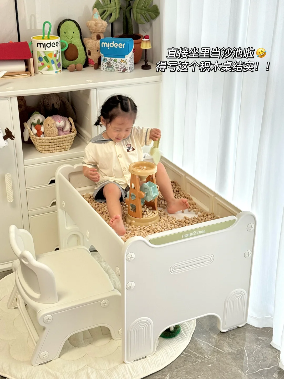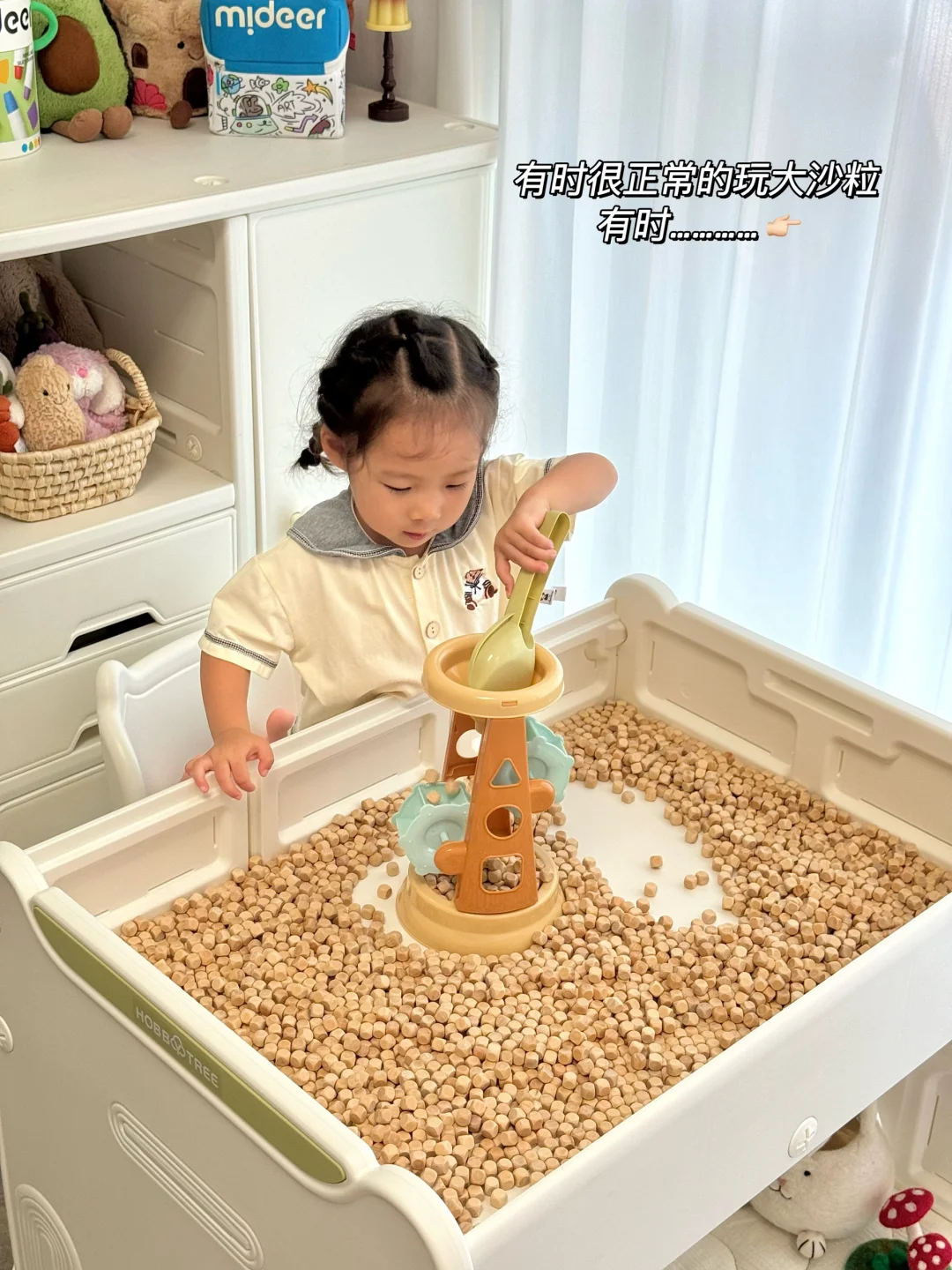 桌板打开可以玩沙粒、搭感官盆、做冰淇淋、捞鱼……