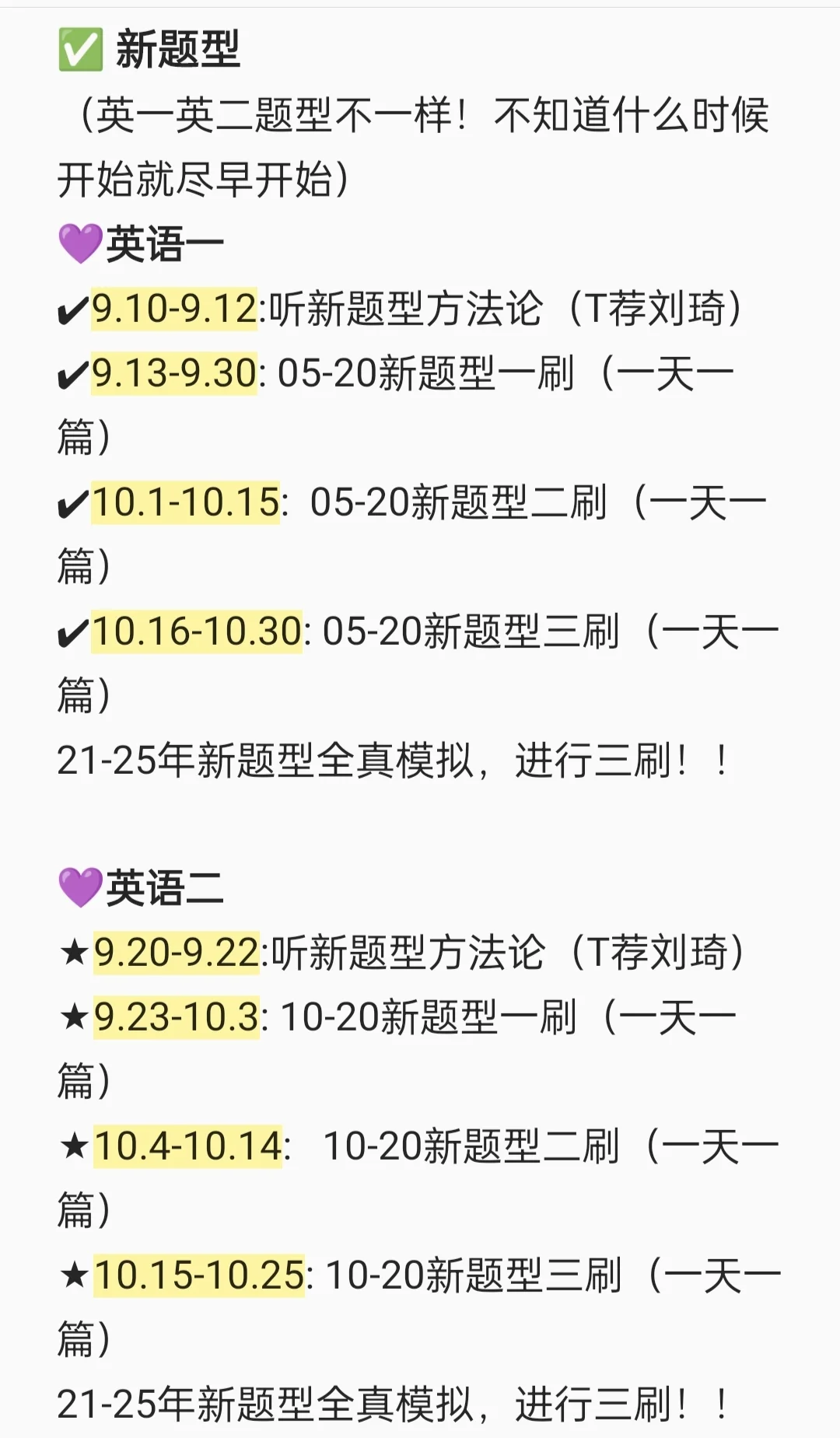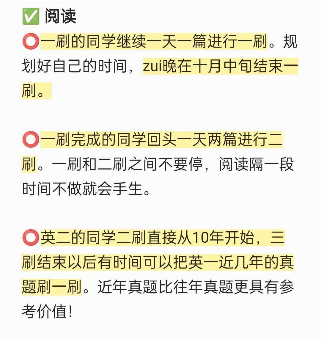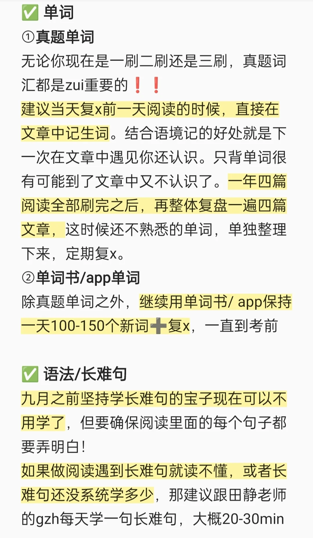 ✅ 单词 ①真题单词 无论你现在是一刷二刷还是三刷,真题词汇都是zui重要的❗❗ 建议当天复x前一天阅读的时候,直接在文章中记生词。结合语境记的好处就是下一次在文章中遇见你还认识。只背单词很有可能到了文章中又不认识了。一年四篇阅读全部刷完之后,再整体复盘一遍四篇文章,这时候还不熟悉的单词,单独整理下来,定期复x。 ②单词书/app单词 除真题单词之外,继续用单词书/ app保持一天100-150个新词➕复x,一直到考前 —— ✅ 语法/长难句 ✔九月之前坚持学长难句的宝子现在可以不用学了,但要确保阅读里面的每个句子都要弄明白! ✔如果做阅读遇到长难句就读不懂,或者长难句还没系统学多少,那建议跟田静老师的gzh每天学一句长难句,大概20-30min —— ✅ 阅读 ⭕一刷的同学继续一天一篇进行一刷。规划好自己的时间,zui晚在十月中旬结束一刷。 ⭕一刷完成的同学回头一天两篇进行二刷。一刷和二刷之间不要停,阅读隔一段时间不做就会手生。 ⭕英二的同学二刷直接从10年开始,三刷结束以后有时间可以把英一近几年的真题刷一刷。近年真题比往年真题更具有参考价值! —— ✅ 作文 作文想按部就班听课的同学,无论阅读做到哪里都建议九月开始学作文,时间规划如下👇🏼 ⭕基础阶段 ⏰9.10-9.20:  小作文精讲➕实训共3大节。 每一节里面讲了两篇大作文。三天消化一节课,可以两天听课,第三天默写。也可以一天听完课,后面两天分别默写精讲和实训的作文。 ⏰9.21-9.30: 大作文精讲➕实训共2大节。 每大节里面讲了两篇大作文。因为大作文刚开始听有难度,所以建议听完一篇就复x默写一篇,再继续往下听。十天完成2大节基础课,消化4篇大作文。 ⭕真题带练 ⏰10.1-10.10: 小作文11-15年真题带练,共5小节,需10天。一天听课,一天默写。 ⏰10.11-10.20:  大作文11-15年真题带练,共5小节,需10天。一天听课一天默写。 ⏰10.21-10.31:  小作文16-19年真题带练。共4小节,需8天。一天听课,一天默写。 ⏰11.1-11.10:  大作文16-19年真题带练。共4小节,需8天。一天听课,一天默写。 (这样安排是为了大小作文交叉着学,避免长时间学小作文,再把大作文忘完了) 🌷字数限制,作文剩下的规划和小三门的安排看图