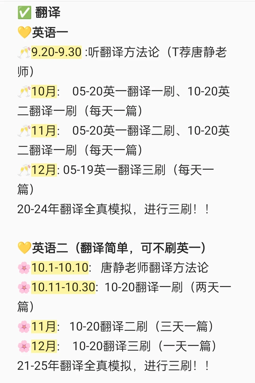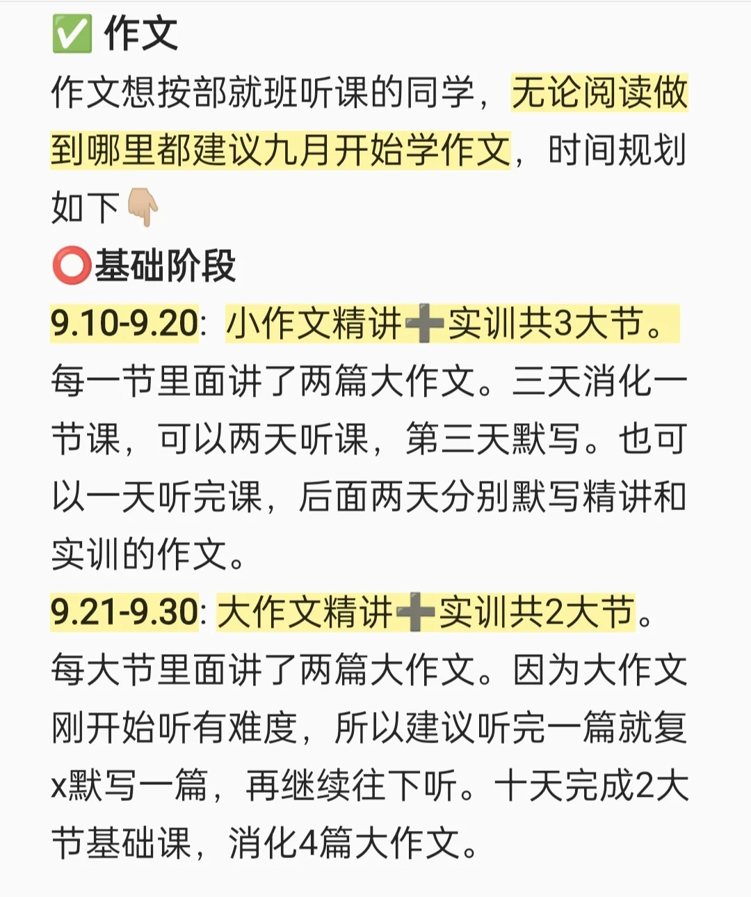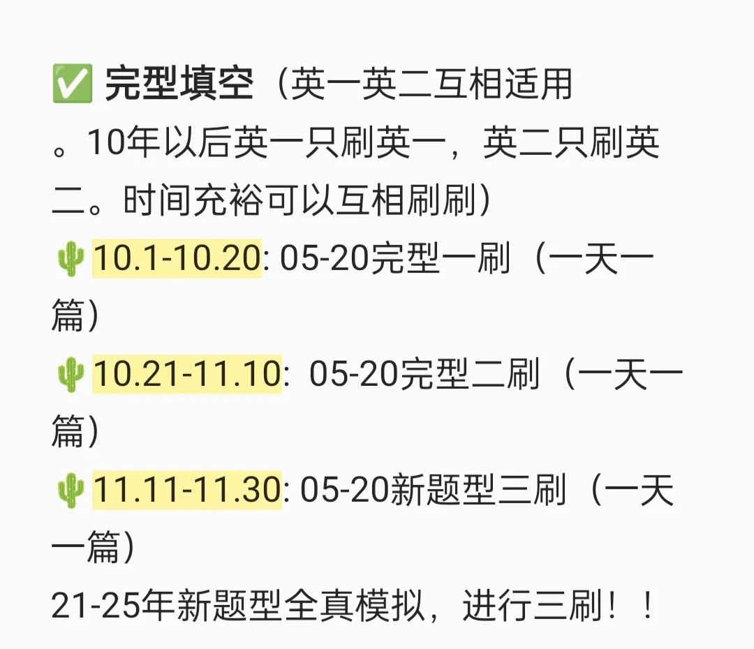 ✅ 单词 ①真题单词 无论你现在是一刷二刷还是三刷,真题词汇都是zui重要的❗❗ 建议当天复x前一天阅读的时候,直接在文章中记生词。结合语境记的好处就是下一次在文章中遇见你还认识。只背单词很有可能到了文章中又不认识了。一年四篇阅读全部刷完之后,再整体复盘一遍四篇文章,这时候还不熟悉的单词,单独整理下来,定期复x。 ②单词书/app单词 除真题单词之外,继续用单词书/ app保持一天100-150个新词➕复x,一直到考前 —— ✅ 语法/长难句 ✔九月之前坚持学长难句的宝子现在可以不用学了,但要确保阅读里面的每个句子都要弄明白! ✔如果做阅读遇到长难句就读不懂,或者长难句还没系统学多少,那建议跟田静老师的gzh每天学一句长难句,大概20-30min —— ✅ 阅读 ⭕一刷的同学继续一天一篇进行一刷。规划好自己的时间,zui晚在十月中旬结束一刷。 ⭕一刷完成的同学回头一天两篇进行二刷。一刷和二刷之间不要停,阅读隔一段时间不做就会手生。 ⭕英二的同学二刷直接从10年开始,三刷结束以后有时间可以把英一近几年的真题刷一刷。近年真题比往年真题更具有参考价值! —— ✅ 作文 作文想按部就班听课的同学,无论阅读做到哪里都建议九月开始学作文,时间规划如下👇🏼 ⭕基础阶段 ⏰9.10-9.20:  小作文精讲➕实训共3大节。 每一节里面讲了两篇大作文。三天消化一节课,可以两天听课,第三天默写。也可以一天听完课,后面两天分别默写精讲和实训的作文。 ⏰9.21-9.30: 大作文精讲➕实训共2大节。 每大节里面讲了两篇大作文。因为大作文刚开始听有难度,所以建议听完一篇就复x默写一篇,再继续往下听。十天完成2大节基础课,消化4篇大作文。 ⭕真题带练 ⏰10.1-10.10: 小作文11-15年真题带练,共5小节,需10天。一天听课,一天默写。 ⏰10.11-10.20:  大作文11-15年真题带练,共5小节,需10天。一天听课一天默写。 ⏰10.21-10.31:  小作文16-19年真题带练。共4小节,需8天。一天听课,一天默写。 ⏰11.1-11.10:  大作文16-19年真题带练。共4小节,需8天。一天听课,一天默写。 (这样安排是为了大小作文交叉着学,避免长时间学小作文,再把大作文忘完了) 🌷字数限制,作文剩下的规划和小三门的安排看图