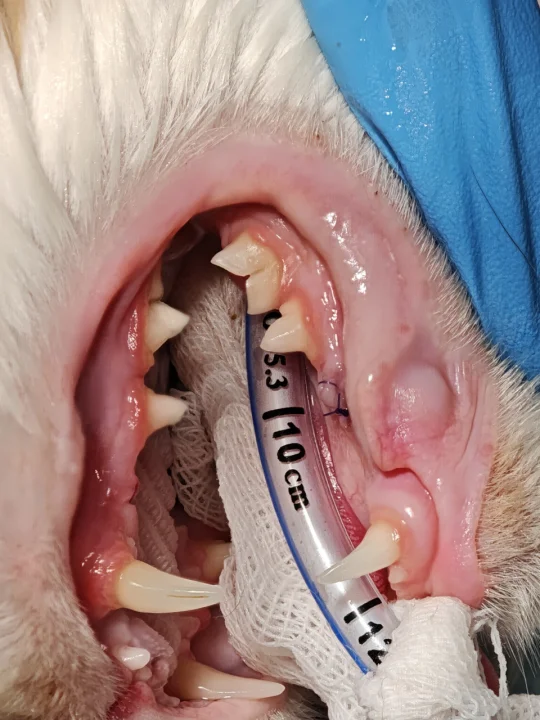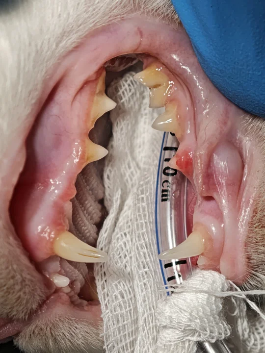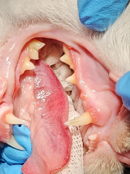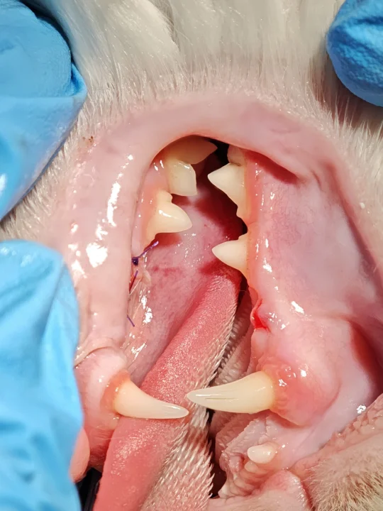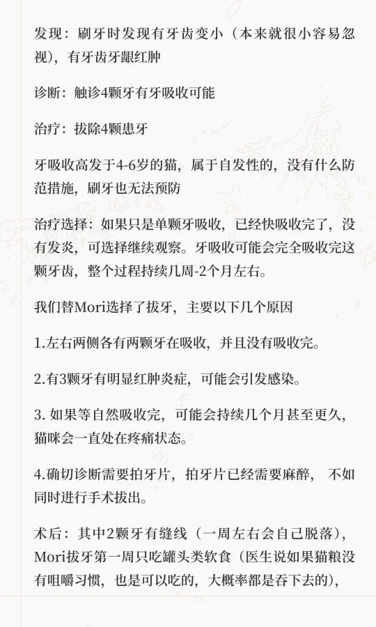 术后:其中2颗牙有缝线(一周左右会自己脱落), Mori拔牙第一周只吃罐头类软食(医生说如果猫粮没有咀嚼习惯,也是可以吃的,大概率都是吞下去的),外加3天止疼药,每日两次可鲁口喷。第二周后半周恢复正常进食。