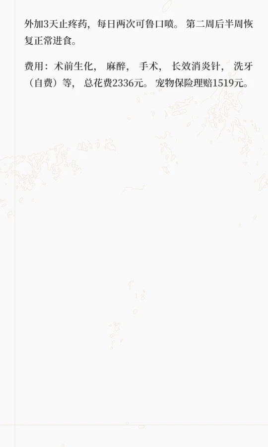费用:术前生化,麻醉,手术,长效消炎针,洗牙(自费)等,总花费2336元。宠物保险理赔1519元。