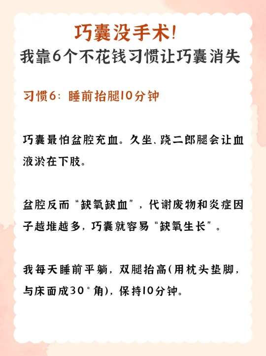 巧囊最怕盆腔充血。久坐、跷二郎腿会让血液淤在下肢,盆腔反而“缺氧缺血”,代谢废物和炎症因子越堆越多,巧囊就容易“缺氧生长”。