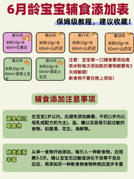 •注意要点⚠️:第一口必须是高铁米粉,新食物要有3天排敏期,晚上别加新的。1岁内别碰蜂蜜、牛奶(这阶段还是以母乳或配方奶为主)、盐、糖,还有蛋清、花生、海鲜这些易过敏的。从单一食物加起,每种新食物观察3 - 5天,没过敏、不消化不良,再添下一种,慢慢丰富种类。