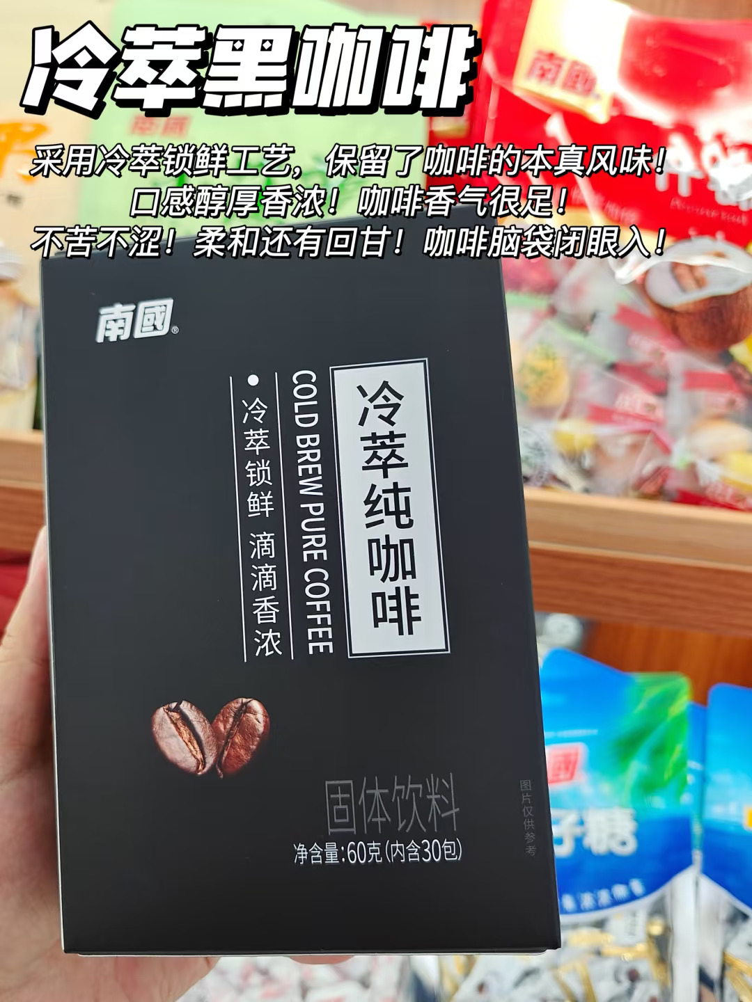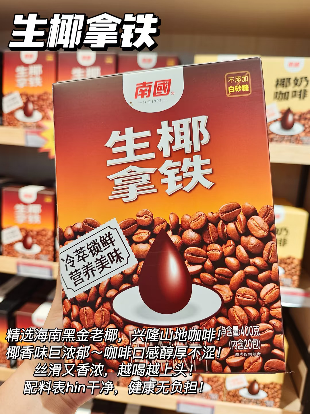 精选海南黑金老椰,兴隆山地咖啡!椰香味巨浓郁~咖啡口感醇厚不涩!丝滑又香浓,越喝越上头!配料表hin干净,健康无负担!