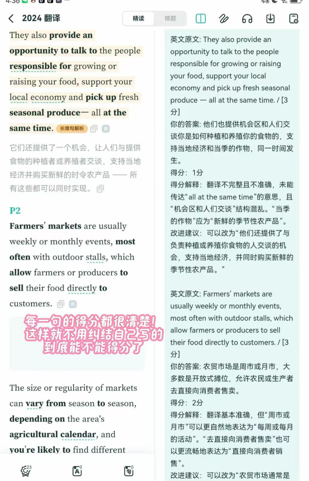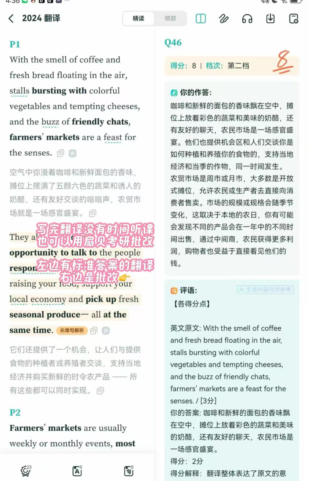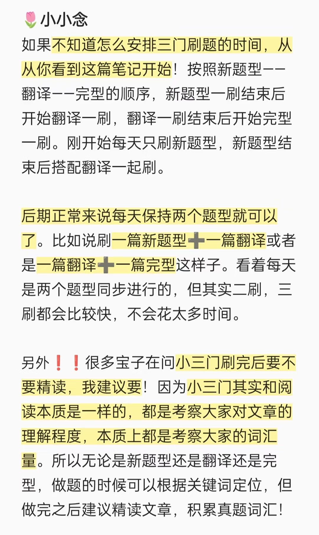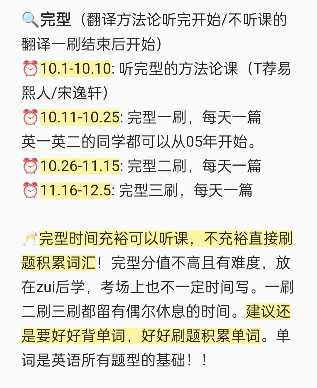 🎉🎉时间上,新题型完成一刷后就进行翻译一刷,一天一篇。英一英二的同学都建议做完真题之后去听对应的真题讲解,老师会跟你说怎么写才有分。记住一定要把长句子变成短句子,多写小句子!