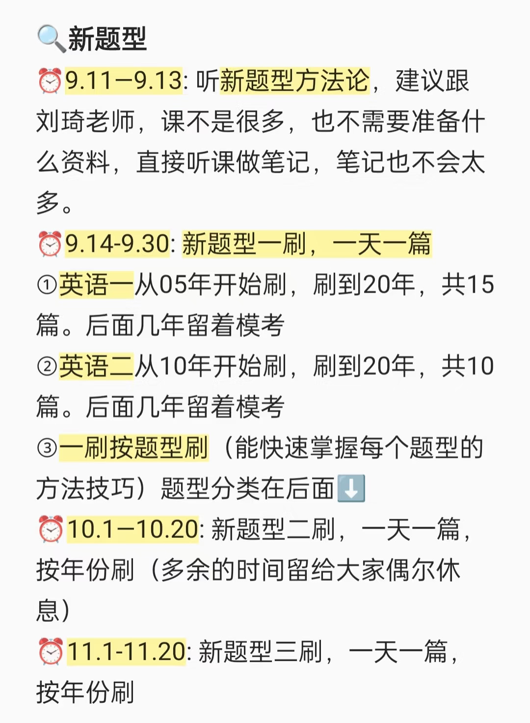 ⏰9.11—9.13: 听新题型方法论,建议跟刘琦老师,课不是很多,也不需要准备什么资料,直接听课做笔记,笔记也不会太多。