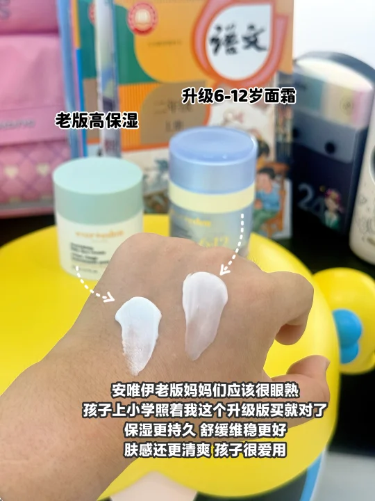 它是安唯伊家老版高保湿的升级款,老版口碑就很好啦,麻麻们可以放心入手,娃上小学的记得照着我买6-12岁这个版本,保湿&肤感都在老版基础上提升不少,质地挺轻盈水润的,我家小孩姐特别爱用,说是没有其他面霜那么油腻腻的很舒服~
