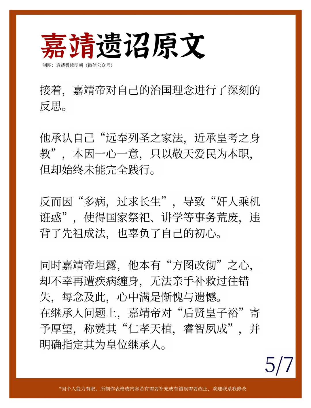 朕以宗人入继大统,获奉宗庙四十五年。深惟享国久长,累朝未有。乃兹弗起,夫复何恨!但念朕远奉列圣之家法,近承皇考之身教,一念惓惓,本惟敬天助民是务,只缘多病,过求长生,遂致奸人乘机诳惑,祷是日举,土木岁兴,郊庙之祀不亲,明讲之仪久废,既违成宪,亦负初心。迩者天启朕衷,方图改彻,而据婴仄疾,补过无由,每思惟增愧恨。